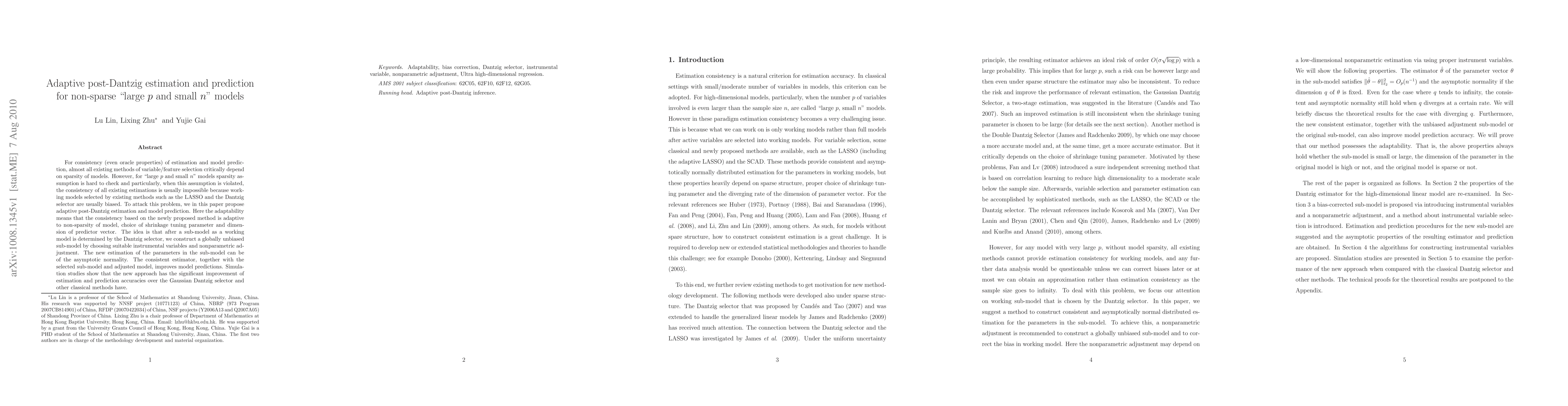 This paper proposes adaptive post-Dantzig estimation and prediction for non-sparse "large $p$ and small $n$" models, addressing the limitations of existing methods that rely on sparsity. The new approach improves estimation and prediction accuracy by constructing a globally unbiased sub-model using instrumental variables and nonparametric adjustment.