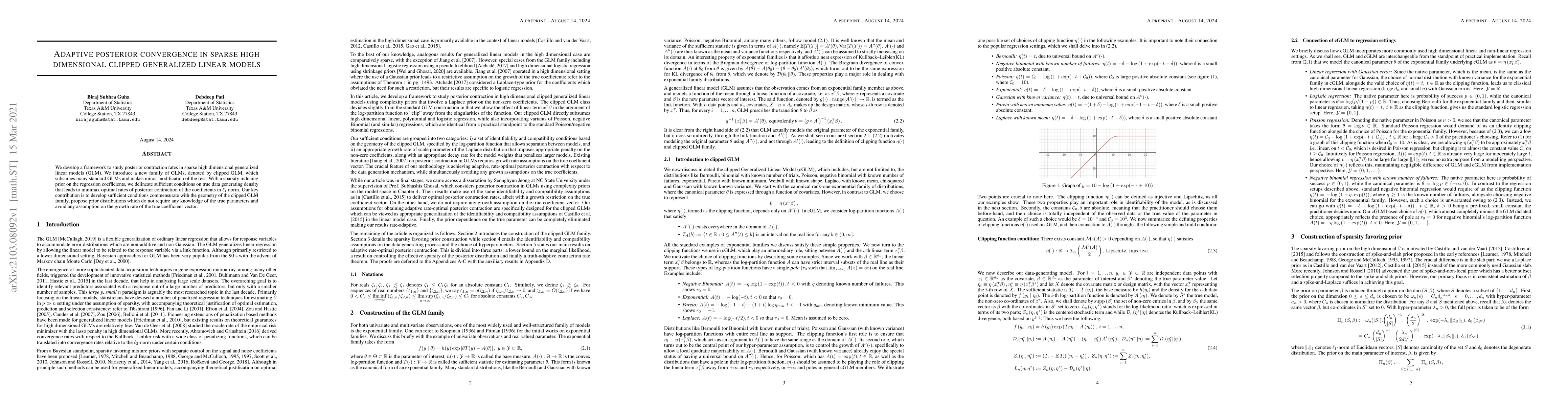 We develop a framework to study posterior contraction rates in sparse high dimensional generalized linear models (GLM). We introduce a new family of GLMs, denoted by clipped GLM, which subsumes many standard GLMs and makes minor modification of the rest. With a sparsity inducing prior on the regression coefficients, we delineate sufficient conditions on true data generating density that leads to minimax optimal rates of posterior contraction of the coefficients in $\ell_1$ norm. Our key contribution is to develop sufficient conditions commensurate with the geometry of the clipped GLM family, propose prior distributions which do not require any knowledge of the true parameters and avoid any assumption on the growth rate of the true coefficient vector.