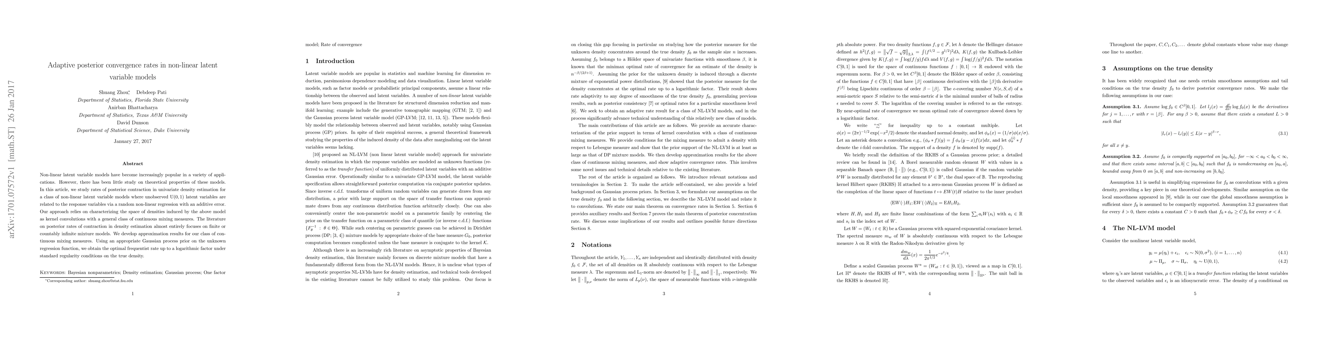 This paper investigates posterior convergence rates in non-linear latent variable models, focusing on univariate density estimation. The authors develop approximation results for continuous mixing measures and achieve optimal frequentist rates for the regression function under standard conditions.