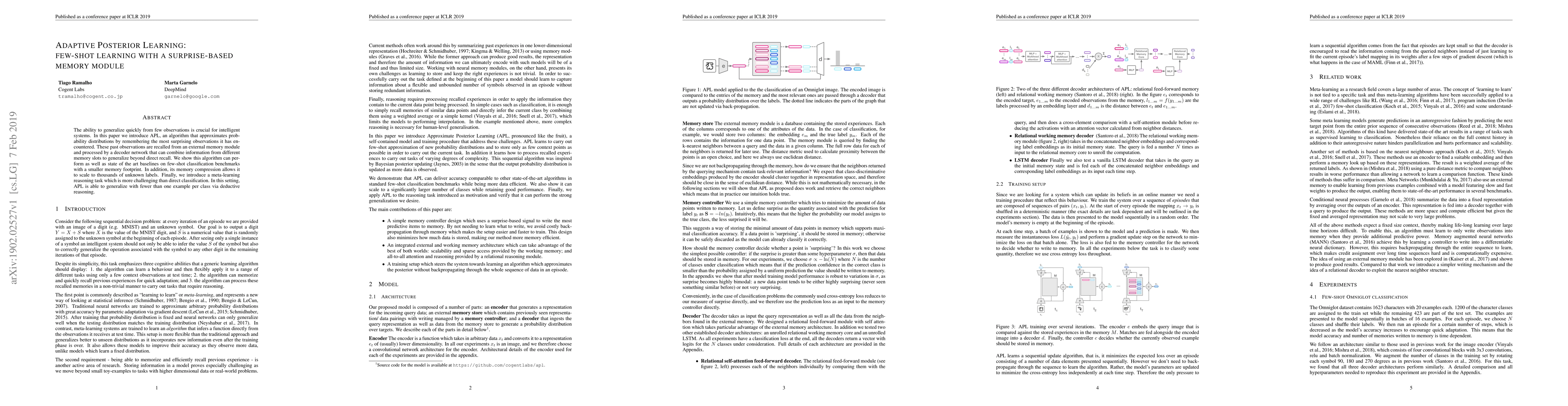 The ability to generalize quickly from few observations is crucial for intelligent systems. In this paper we introduce APL, an algorithm that approximates probability distributions by remembering the most surprising observations it has encountered. These past observations are recalled from an external memory module and processed by a decoder network that can combine information from different memory slots to generalize beyond direct recall. We show this algorithm can perform as well as state of the art baselines on few-shot classification benchmarks with a smaller memory footprint. In addition, its memory compression allows it to scale to thousands of unknown labels. Finally, we introduce a meta-learning reasoning task which is more challenging than direct classification. In this setting, APL is able to generalize with fewer than one example per class via deductive reasoning.