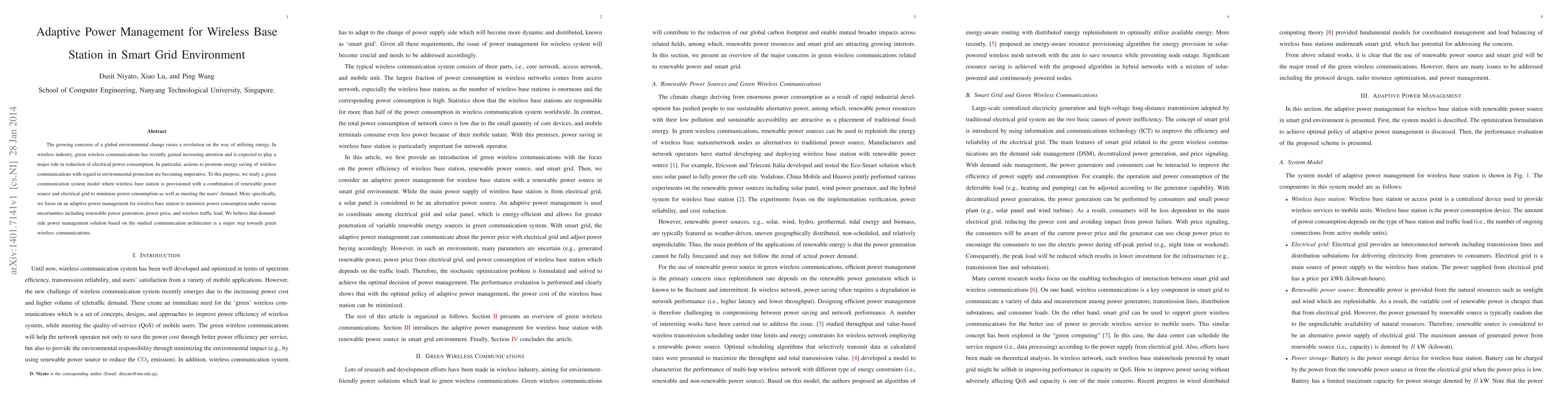 This paper proposes an adaptive power management strategy for wireless base stations in smart grid environments, integrating renewable energy sources and the electrical grid to minimize power consumption while meeting user demand. The approach aims to reduce overall energy use in green wireless communications by addressing uncertainties in renewable power generation, power pricing, and traffic load.