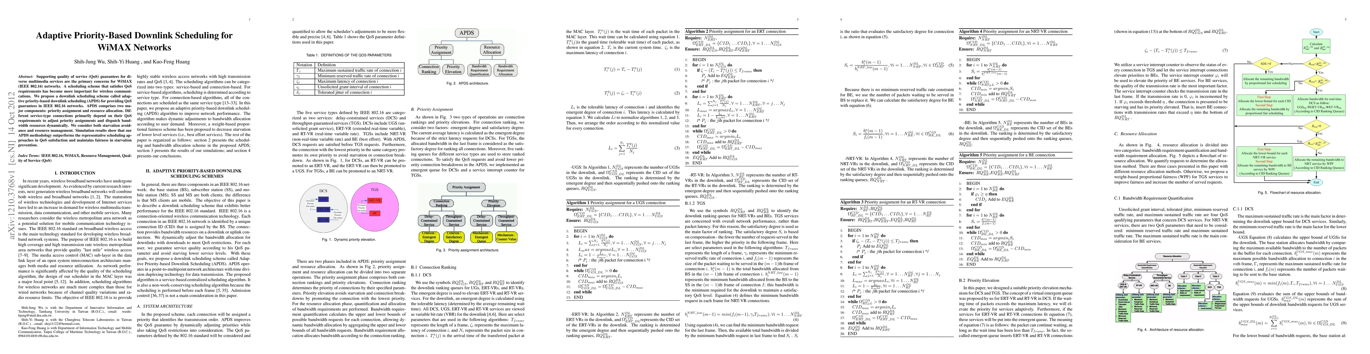 The paper proposes an adaptive priority-based downlink scheduling (APDS) scheme for WiMAX networks to meet QoS requirements for diverse multimedia services. APDS dynamically adjusts priority assignments and allocates resources based on service-type needs, ensuring both starvation avoidance and efficient resource management, with simulation results showing superior QoS satisfaction and fairness compared to existing methods.