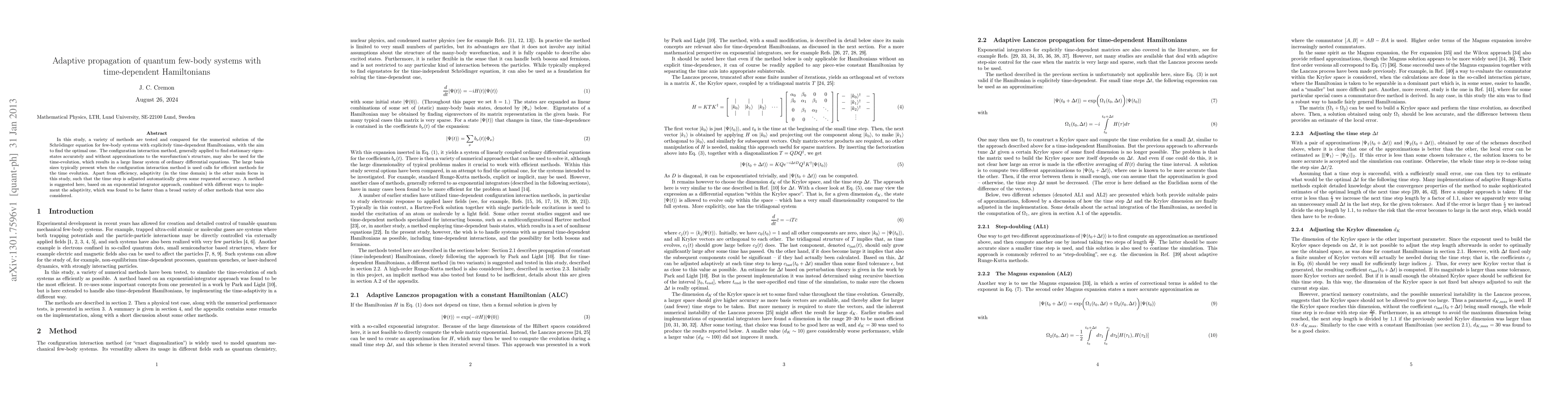 In this study, a variety of methods are tested and compared for the numerical solution of the Schr\"odinger equation for few-body systems with explicitely time-dependent Hamiltonians, with the aim to find the optimal one. The configuration interaction method, generally applied to find stationary eigenstates accurately and without approximations to the wavefunction's structure, may also be used for the time-evolution, which results in a large linear system of ordinary differential equations. The large basis sizes typically present when the configuration interaction method is used calls for efficient methods for the time evolution. Apart from efficiency, adaptivity (in the time domain) is the other main focus in this study, such that the time step is adjusted automatically given some requested accuracy. A method is suggested here, based on an exponential integrator approach, combined with different ways to implement the adaptivity, which was found to be faster than a broad variety of other methods that were also considered.