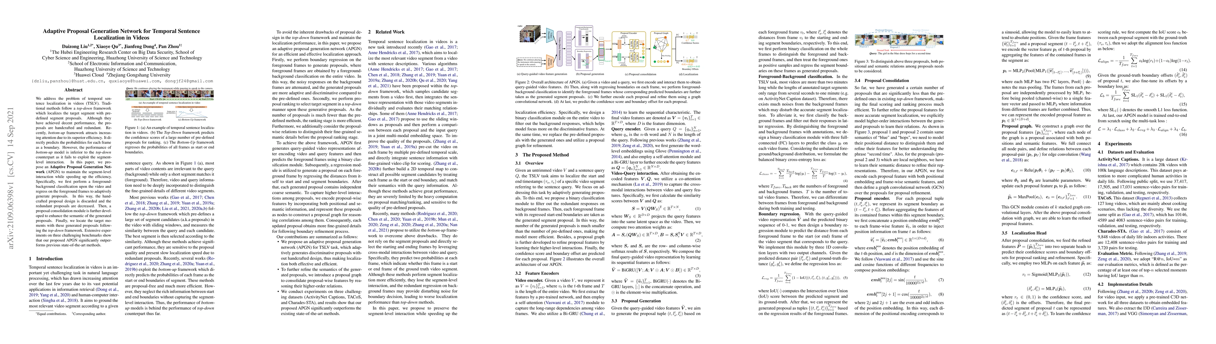 We address the problem of temporal sentence localization in videos (TSLV). Traditional methods follow a top-down framework which localizes the target segment with pre-defined segment proposals. Although they have achieved decent performance, the proposals are handcrafted and redundant. Recently, bottom-up framework attracts increasing attention due to its superior efficiency. It directly predicts the probabilities for each frame as a boundary. However, the performance of bottom-up model is inferior to the top-down counterpart as it fails to exploit the segment-level interaction. In this paper, we propose an Adaptive Proposal Generation Network (APGN) to maintain the segment-level interaction while speeding up the efficiency. Specifically, we first perform a foreground-background classification upon the video and regress on the foreground frames to adaptively generate proposals. In this way, the handcrafted proposal design is discarded and the redundant proposals are decreased. Then, a proposal consolidation module is further developed to enhance the semantic of the generated proposals. Finally, we locate the target moments with these generated proposals following the top-down framework. Extensive experiments on three challenging benchmarks show that our proposed APGN significantly outperforms previous state-of-the-art methods.