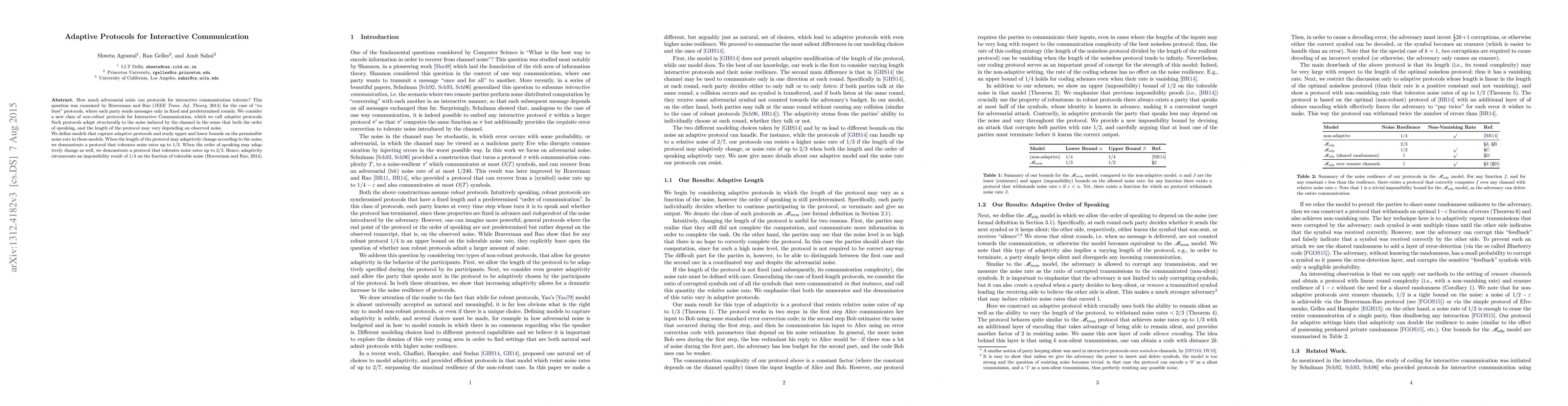 This paper explores adaptive protocols for interactive communication that can dynamically adjust their structure in response to channel noise, achieving higher noise tolerance compared to fixed-round protocols. It demonstrates adaptive protocols that can tolerate noise rates up to $1/3$ and $2/3$ when protocol length and speaking order are flexible, respectively.