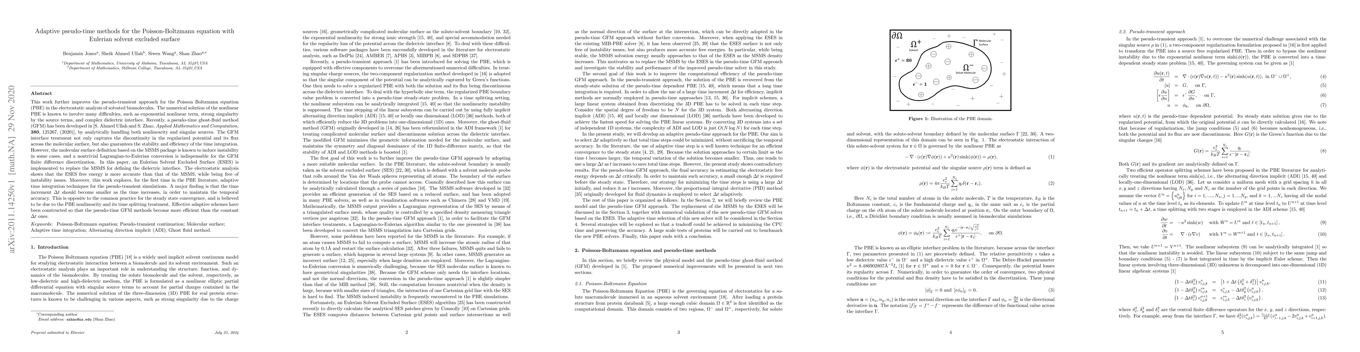This paper enhances the pseudo-transient approach for solving the Poisson-Boltzmann equation (PBE) by introducing an Eulerian Solvent Excluded Surface (ESES) to define the dielectric interface, improving stability and accuracy over previous methods. The adaptive time integration techniques developed here show that smaller time increments are needed as time progresses to maintain accuracy, leading to more efficient simulations compared to constant time step methods.
