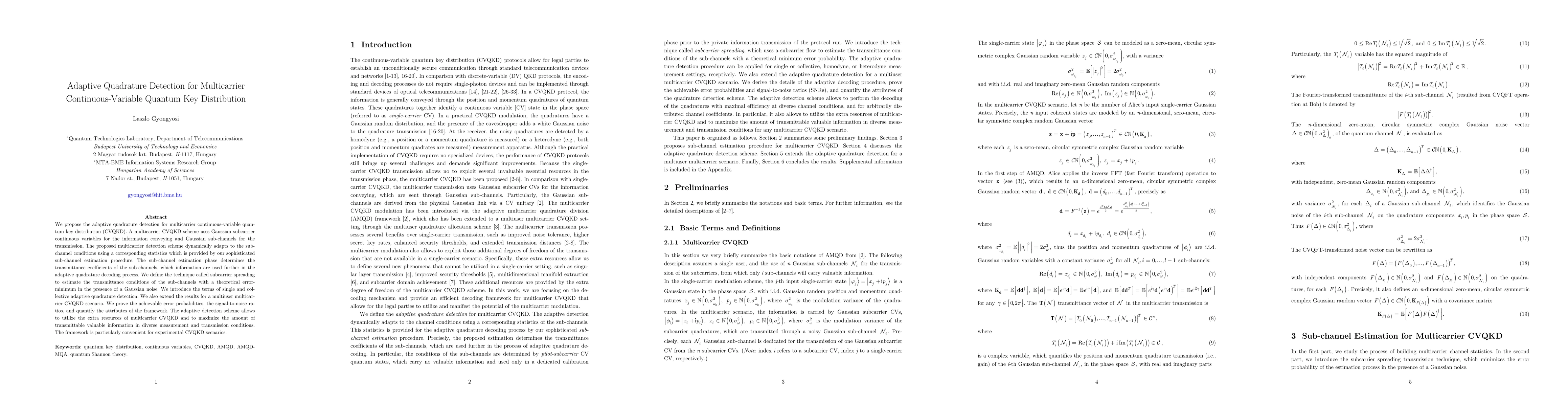 We propose the adaptive quadrature detection for multicarrier continuous-variable quantum key distribution (CVQKD). A multicarrier CVQKD scheme uses Gaussian subcarrier continuous variables for the information conveying and Gaussian sub-channels for the transmission. The proposed multicarrier detection scheme dynamically adapts to the sub-channel conditions using a corresponding statistics which is provided by our sophisticated sub-channel estimation procedure. The sub-channel estimation phase determines the transmittance coefficients of the sub-channels, which information are used further in the adaptive quadrature decoding process. We define the technique called subcarrier spreading to estimate the transmittance conditions of the sub-channels with a theoretical error-minimum in the presence of a Gaussian noise. We introduce the terms of single and collective adaptive quadrature detection. We also extend the results for a multiuser multicarrier CVQKD scenario. We prove the achievable error probabilities, the signal-to-noise ratios, and quantify the attributes of the framework. The adaptive detection scheme allows to utilize the extra resources of multicarrier CVQKD and to maximize the amount of transmittable valuable information in diverse measurement and transmission conditions. The framework is particularly convenient for experimental CVQKD scenarios.