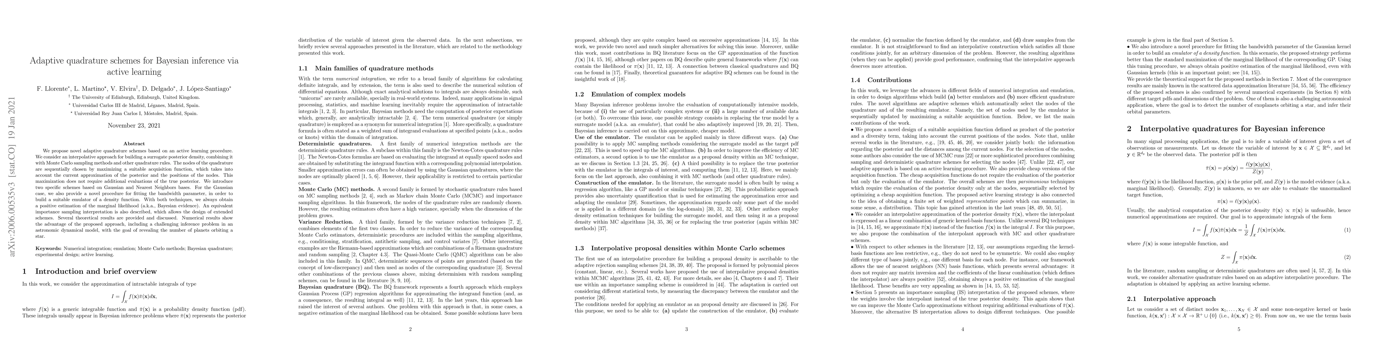 Numerical integration and emulation are fundamental topics across scientific fields. We propose novel adaptive quadrature schemes based on an active learning procedure. We consider an interpolative approach for building a surrogate posterior density, combining it with Monte Carlo sampling methods and other quadrature rules. The nodes of the quadrature are sequentially chosen by maximizing a suitable acquisition function, which takes into account the current approximation of the posterior and the positions of the nodes. This maximization does not require additional evaluations of the true posterior. We introduce two specific schemes based on Gaussian and Nearest Neighbors (NN) bases. For the Gaussian case, we also provide a novel procedure for fitting the bandwidth parameter, in order to build a suitable emulator of a density function. With both techniques, we always obtain a positive estimation of the marginal likelihood (a.k.a., Bayesian evidence). An equivalent importance sampling interpretation is also described, which allows the design of extended schemes. Several theoretical results are provided and discussed. Numerical results show the advantage of the proposed approach, including a challenging inference problem in an astronomic dynamical model, with the goal of revealing the number of planets orbiting a star.