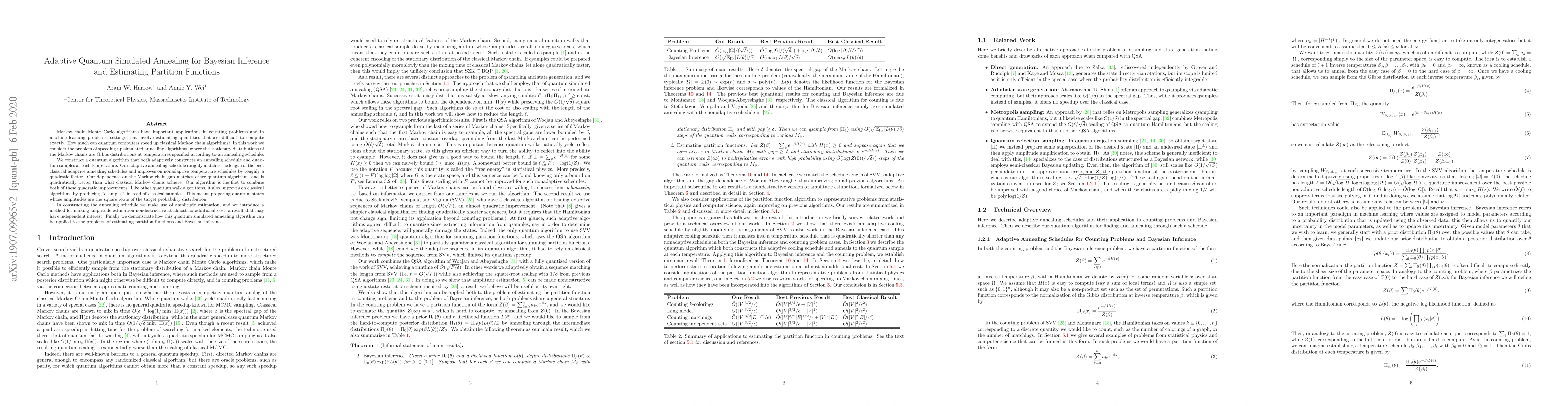 This paper proposes an adaptive quantum simulated annealing algorithm to speed up Markov chain Monte Carlo methods for Bayesian inference and partition function estimation. The algorithm adaptively constructs an annealing schedule and quantum samples, achieving quadratic improvements over classical methods and demonstrating its effectiveness in estimating partition functions and performing Bayesian inference.