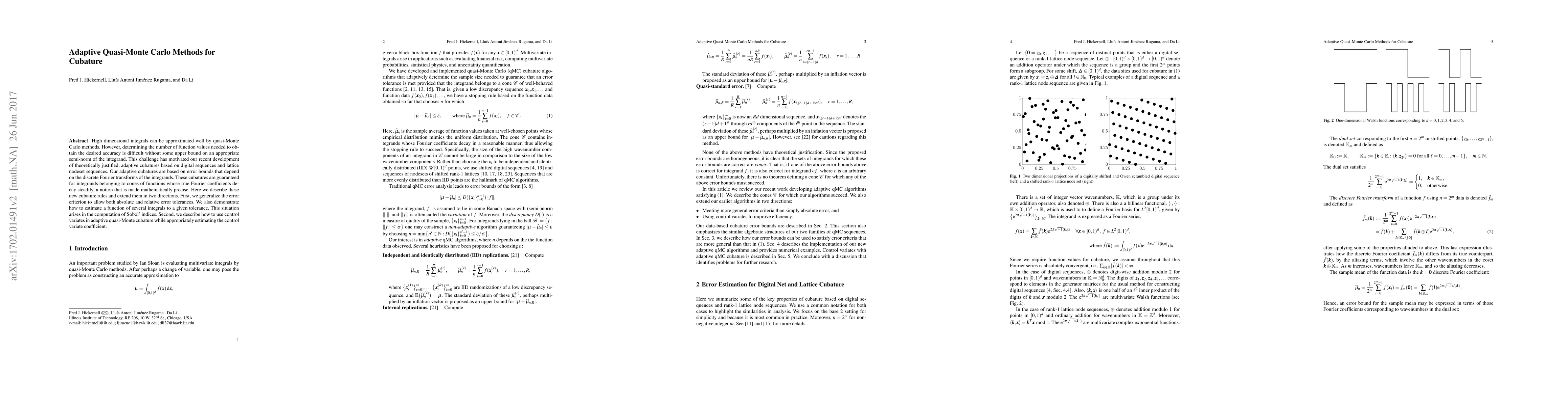 This paper introduces adaptive quasi-Monte Carlo methods for high-dimensional integration, focusing on error bounds based on discrete Fourier transforms. The authors develop adaptive cubature rules that can handle both absolute and relative error tolerances, and demonstrate their application in estimating Sobol' indices, while also incorporating control variates for improved efficiency.