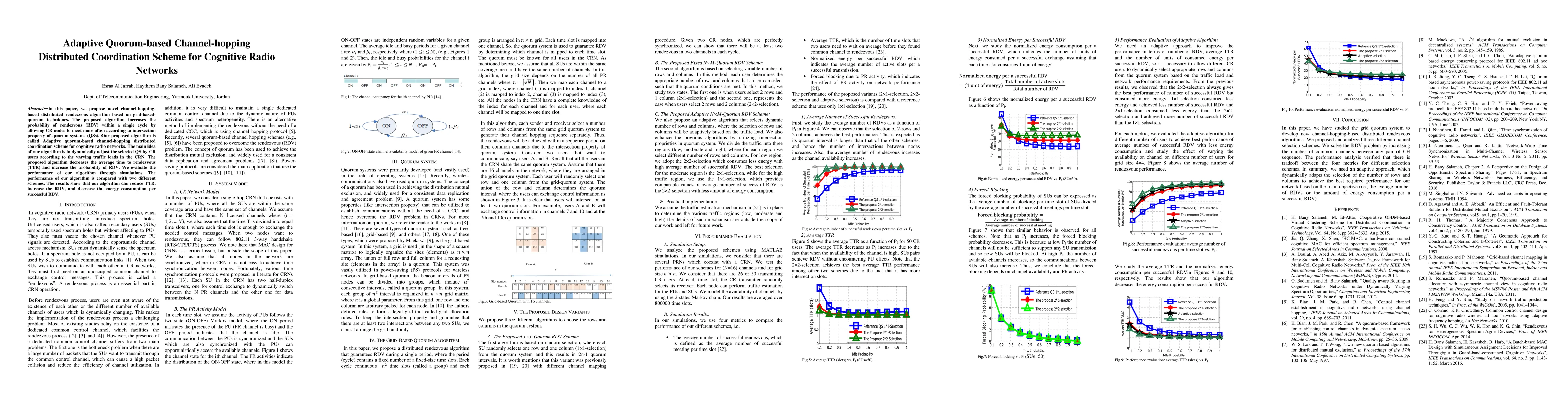 This paper proposes an adaptive quorum-based channel-hopping distributed coordination scheme for cognitive radio networks, which dynamically adjusts quorum selection to optimize rendezvous probability and reduce average time to rendezvous, while also lowering energy consumption per successful rendezvous. Simulation results show improved performance compared to alternative schemes.
