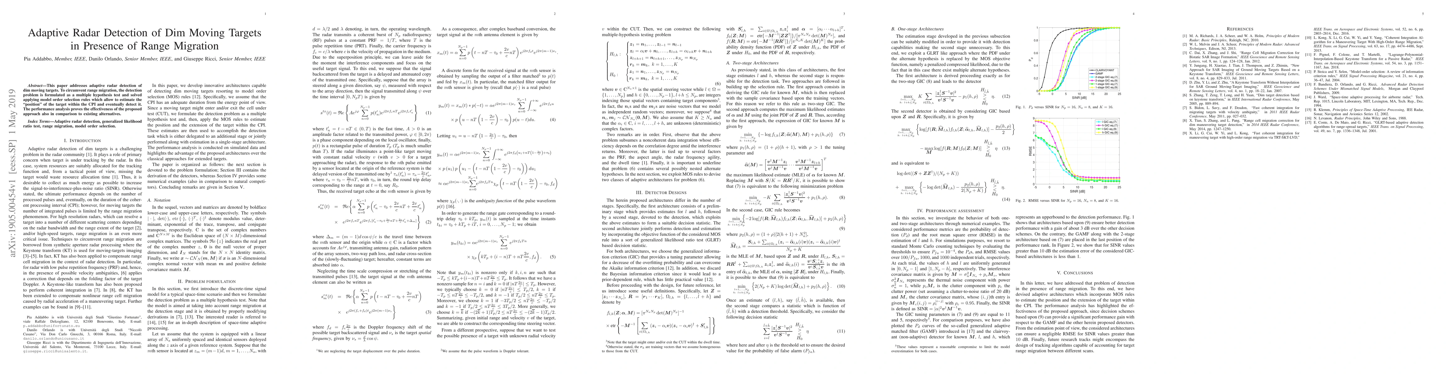 This paper proposes an adaptive radar detection method for dim moving targets, addressing range migration through a multiple hypothesis test and model order selection, demonstrating superior performance compared to existing techniques. The effectiveness of the approach is validated through performance analysis.