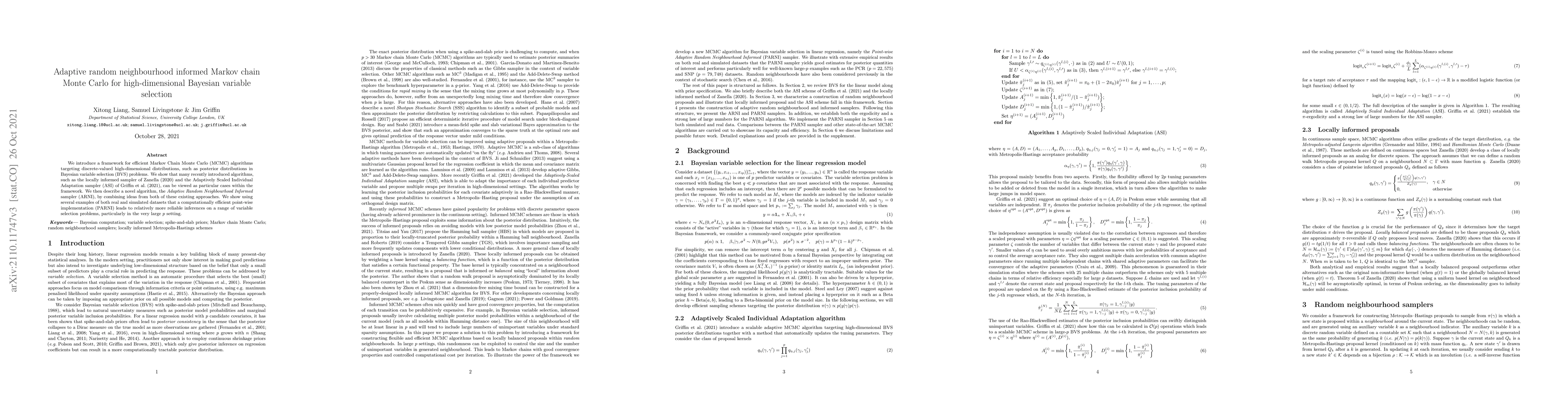 This paper proposes a novel Adaptive Random Neighbourhood Informed Markov Chain Monte Carlo (ARNI) algorithm for efficient Bayesian variable selection in high-dimensional settings. The ARNI method combines elements from existing adaptive MCMC techniques to improve inference reliability, demonstrating superior performance on both real and simulated datasets.
