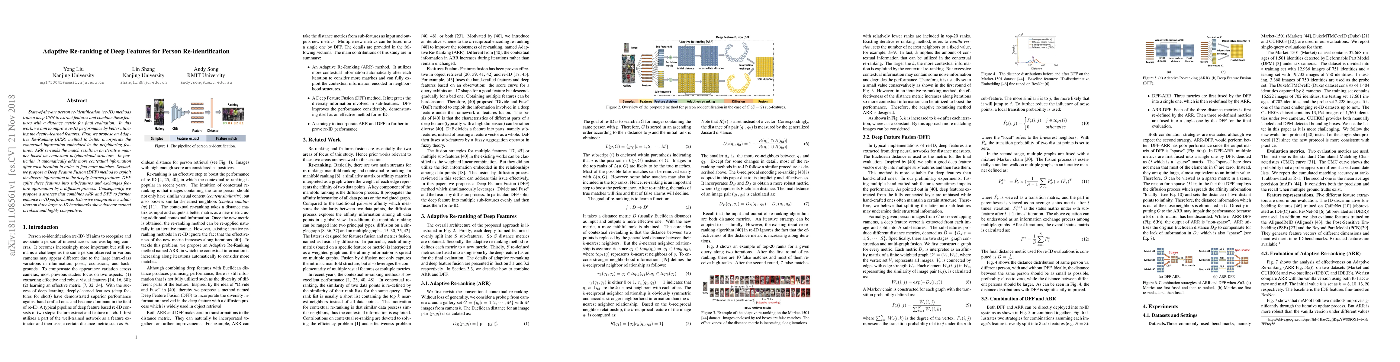 This paper proposes a Deep Feature Fusion (DFF) method to enhance person re-identification by leveraging diverse information in deep features and an Adaptive Re-Ranking (ARR) method to iteratively refine retrieval results using contextual neighbor information. The combined approach significantly outperforms existing methods on benchmark datasets.
