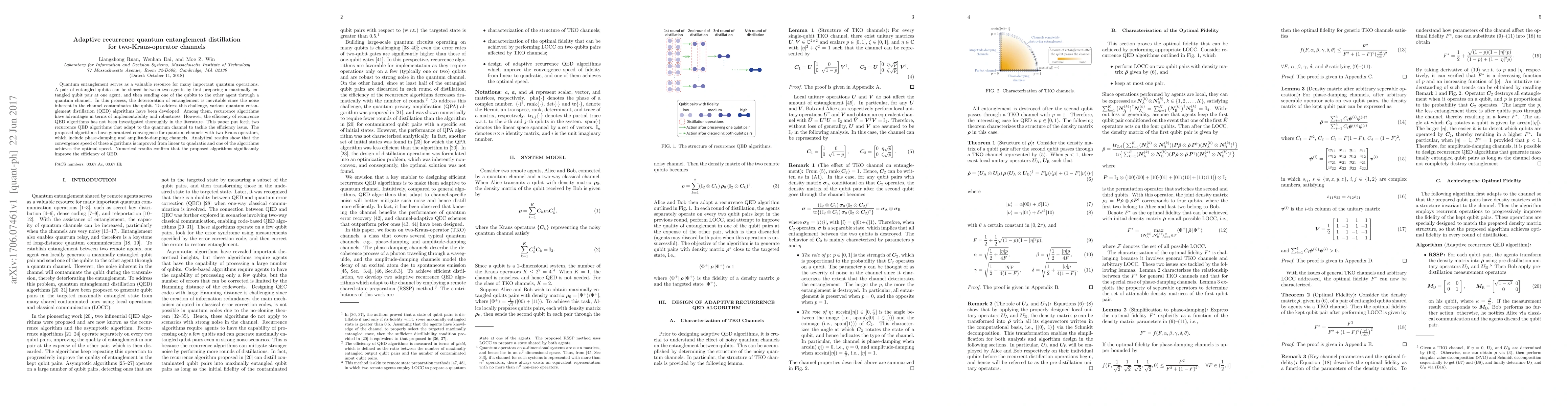 This paper proposes adaptive recurrence quantum entanglement distillation algorithms for two-Kraus-operator channels, improving the efficiency of entanglement preservation. The algorithms achieve quadratic convergence speed, outperforming linear convergence, and one algorithm achieves optimal speed, significantly enhancing the efficiency of quantum entanglement distillation.