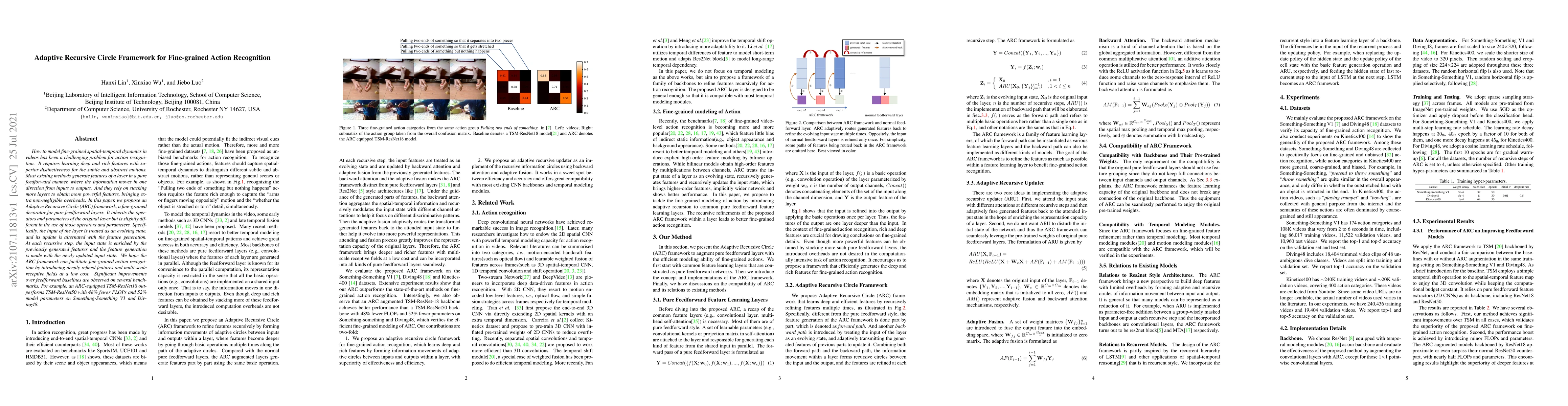 The paper proposes an Adaptive Recursive Circle (ARC) framework to enhance fine-grained action recognition by generating deeply refined features and multi-scale receptive fields through recursive feature updates, achieving significant improvements over traditional feedforward methods with lower computational costs. ARC-enhanced models outperform larger baselines in benchmarks with fewer FLOPs and parameters.