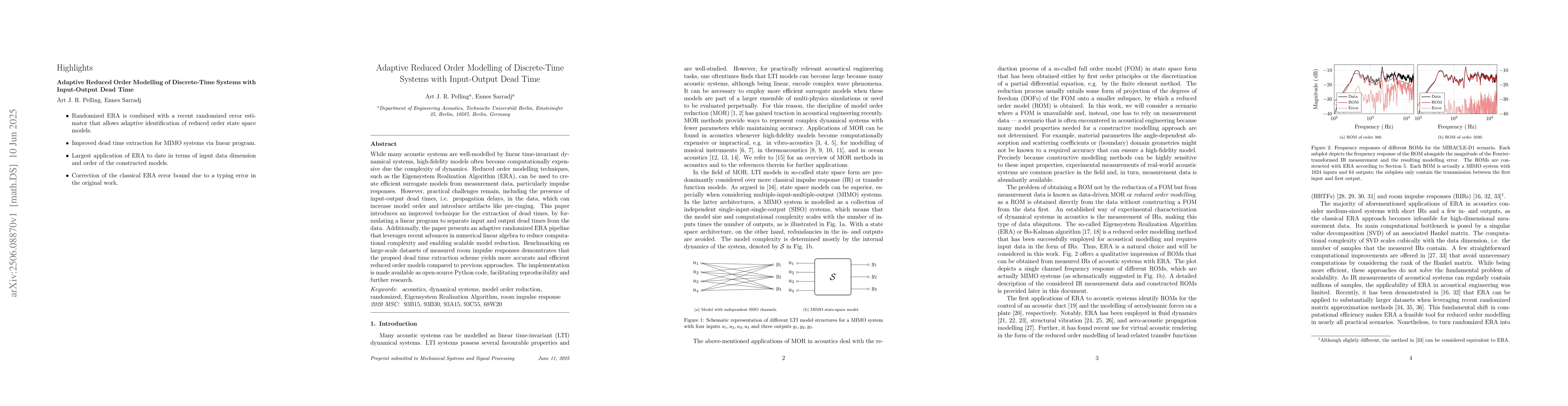 While many acoustic systems are well-modelled by linear time-invariant dynamical systems, high-fidelity models often become computationally expensive due the complexity of dynamics. Reduced order modelling techniques, such as the Eigensystem Realization Algorithm (ERA), can be used to create efficient surrogate models from measurement data, particularly impulse responses. However, practical challenges remain, including the presence of input-output dead times, i.e. propagation delays, in the data, which can increase model order and introduce artifacts like pre-ringing. This paper introduces an improved technique for the extraction of dead times, by formulating a linear program to separate input and output dead times from the data. Additionally, the paper presents an adaptive randomized ERA pipeline that leverages recent advances in numerical linear algebra to reduce computational complexity and enabling scalable model reduction. Benchmarking on large-scale datasets of measured room impulse responses demonstrates that the propsed dead time extraction scheme yields more accurate and efficient reduced order models compared to previous approaches. The implementation is made available as open-source Python code, facilitating reproducibility and further research.
