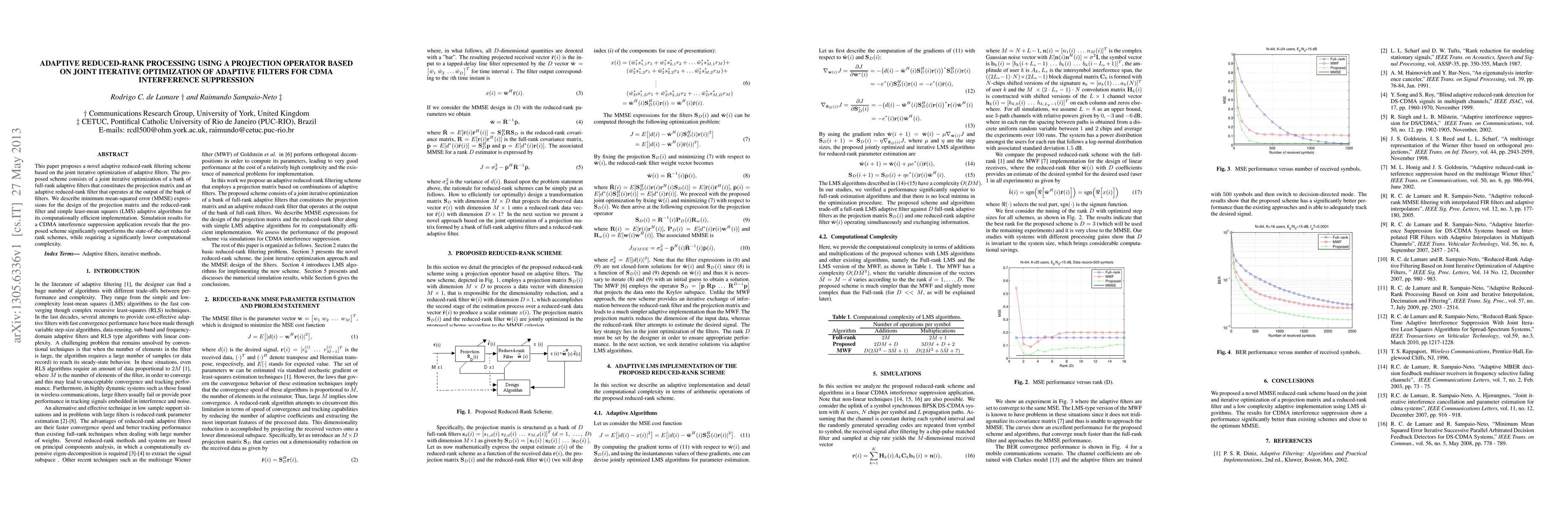 This paper introduces an adaptive reduced-rank filtering scheme using joint iterative optimization of adaptive filters for CDMA interference suppression, achieving superior performance with lower computational complexity compared to existing methods. The scheme employs MMSE expressions and LMS algorithms for efficient implementation.