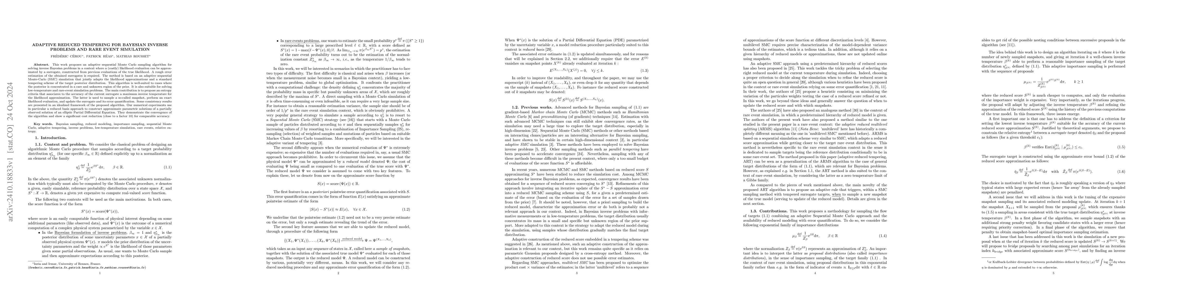This paper introduces an adaptive sequential Monte Carlo algorithm for solving Bayesian inverse problems and rare event simulations using surrogate likelihood approximations. The proposed method employs a tempering scheme and an entropy criteria to enhance efficiency and accuracy, showing significant cost reductions in numerical experiments.