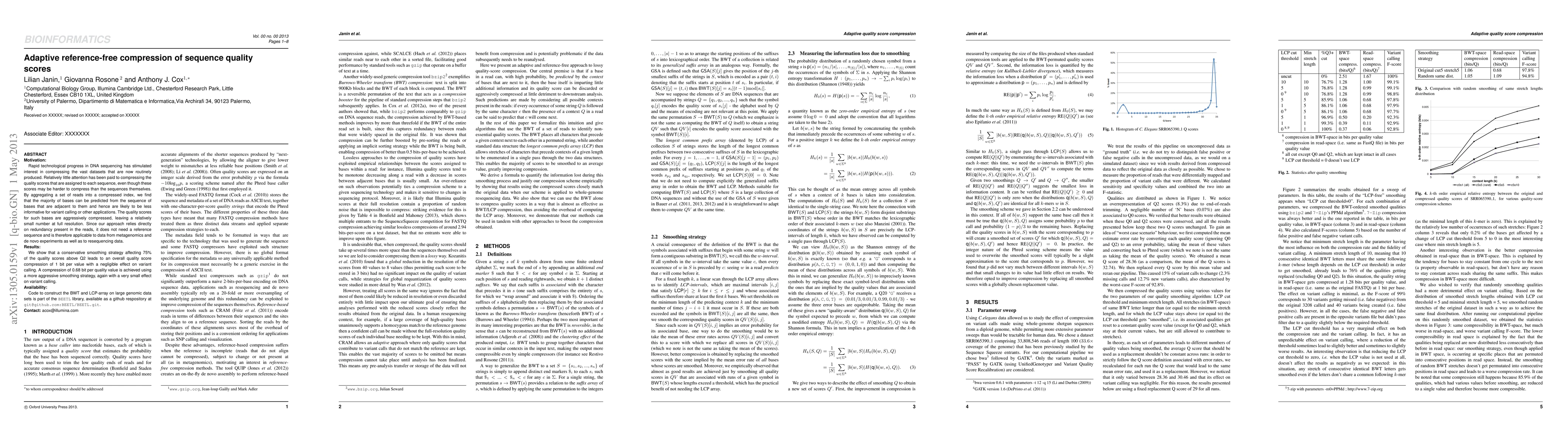 Motivation: Rapid technological progress in DNA sequencing has stimulated interest in compressing the vast datasets that are now routinely produced. Relatively little attention has been paid to compressing the quality scores that are assigned to each sequence, even though these scores may be harder to compress than the sequences themselves. By aggregating a set of reads into a compressed index, we find that the majority of bases can be predicted from the sequence of bases that are adjacent to them and hence are likely to be less informative for variant calling or other applications. The quality scores for such bases are aggressively compressed, leaving a relatively small number at full resolution. Since our approach relies directly on redundancy present in the reads, it does not need a reference sequence and is therefore applicable to data from metagenomics and de novo experiments as well as to resequencing data. Results: We show that a conservative smoothing strategy affecting 75% of the quality scores above Q2 leads to an overall quality score compression of 1 bit per value with a negligible effect on variant calling. A compression of 0.68 bit per quality value is achieved using a more aggressive smoothing strategy, again with a very small effect on variant calling. Availability: Code to construct the BWT and LCP-array on large genomic data sets is part of the BEETL library, available as a github respository at http://[email protected]:BEETL/BEETL.git .