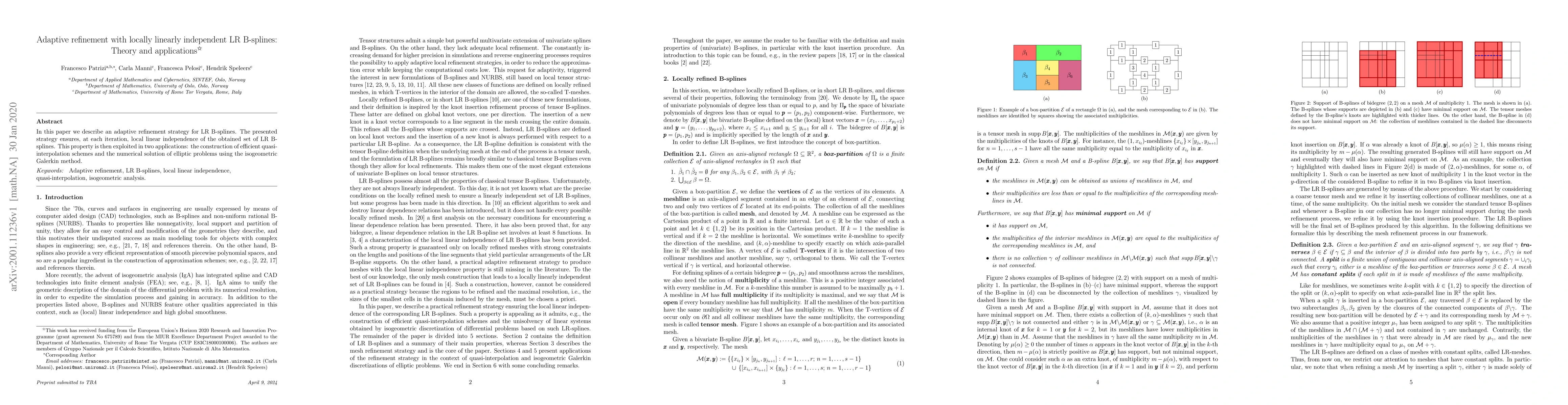 This paper proposes an adaptive refinement method for LR B-splines that maintains local linear independence, which is used to develop efficient quasi-interpolation schemes and solve elliptic problems via the isogeometric Galerkin method.