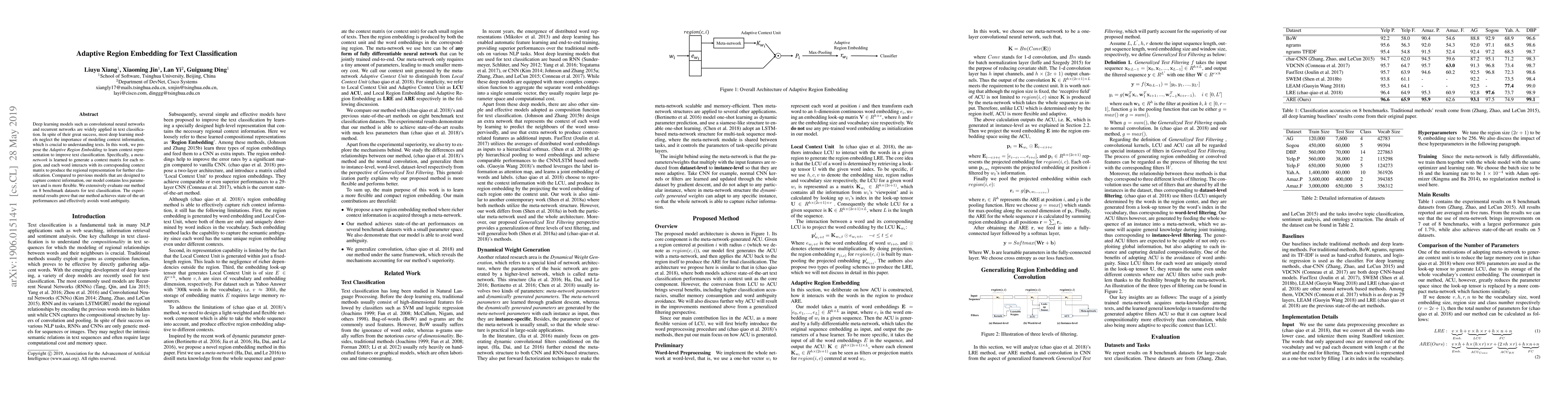 This paper proposes Adaptive Region Embedding to improve text classification by learning context representations, using a metanetwork to generate context matrices for each region. The model achieves state-of-the-art performance on 8 benchmark datasets, demonstrating its effectiveness in avoiding word ambiguity.