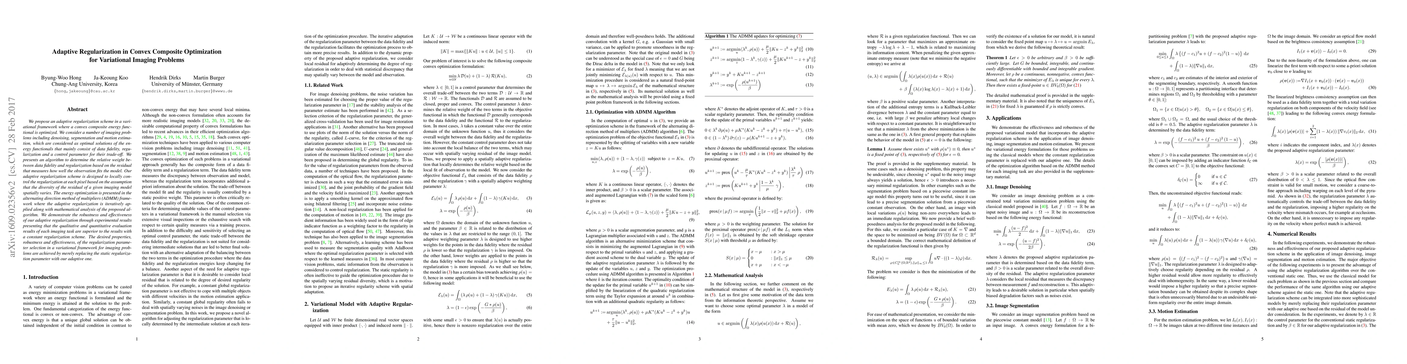 This paper proposes an adaptive regularization scheme within a variational framework to optimize convex composite energy functionals for imaging tasks like denoising, segmentation, and motion estimation. The adaptive method adjusts regularization weights based on the residual, demonstrating superior performance compared to constant regularization through both qualitative and quantitative evaluations.