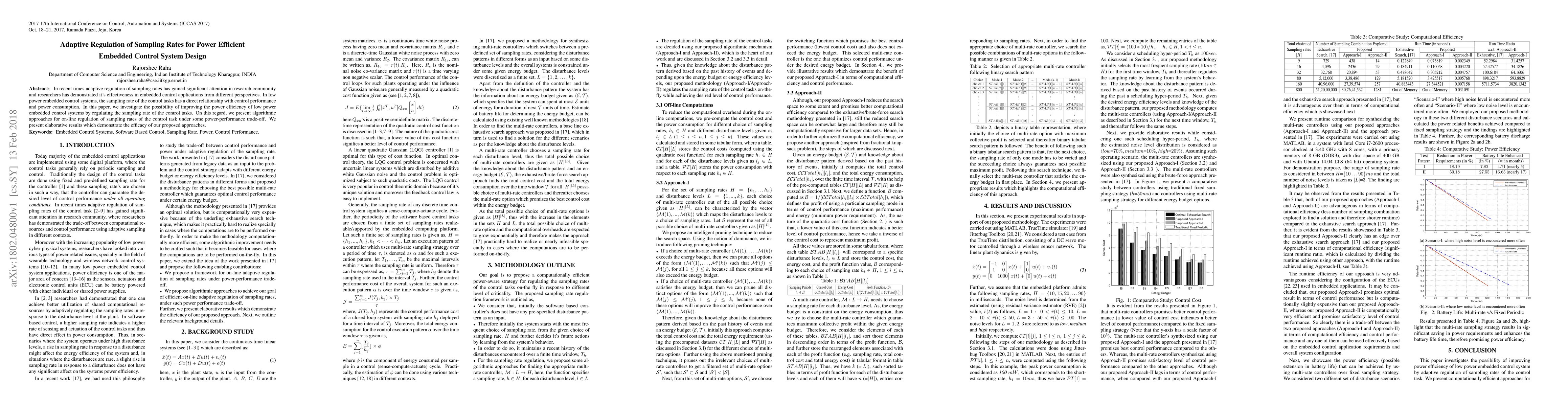 In recent times adaptive regulation of sampling rates has gained significant attention in research community and researchers has demonstrated it's effectiveness in embedded control applications from different perspectives. In low power embedded control systems, the sampling rate of the control tasks has a direct relationship with control performance and power consumption. In this paper, we investigate the possibility of improving the power efficiency of low power embedded control systems by regulating the sampling rate of the control tasks. On this regard, we present algorithmic approaches for on-line regulation of sampling rates of the control task under some power-performance trade-off. We present elaborative results which demonstrate the efficacy of our proposed approaches.
