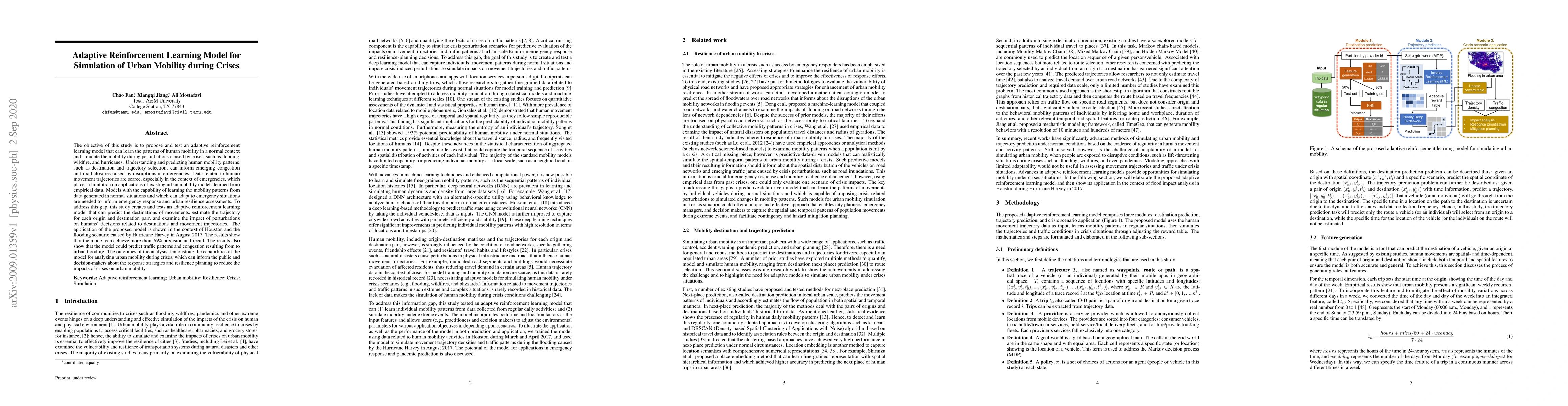 This study proposes an adaptive reinforcement learning model to simulate urban mobility during crises like flooding, wildfire, and hurricanes, achieving over 76% precision and recall. The model predicts movement patterns and congestion, demonstrating its utility in informing emergency response and resilience planning.