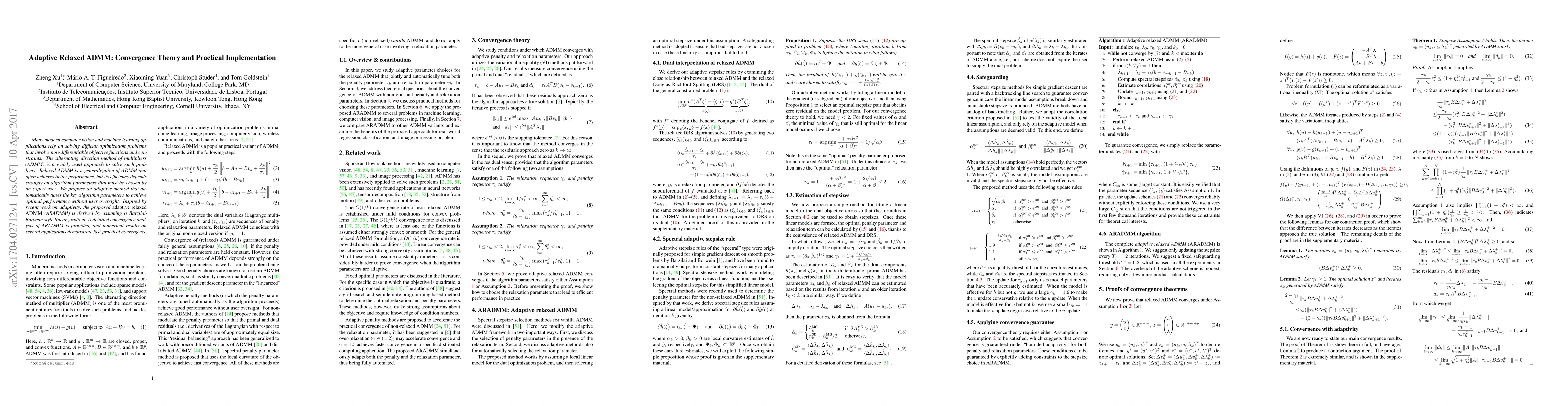 Many modern computer vision and machine learning applications rely on solving difficult optimization problems that involve non-differentiable objective functions and constraints. The alternating direction method of multipliers (ADMM) is a widely used approach to solve such problems. Relaxed ADMM is a generalization of ADMM that often achieves better performance, but its efficiency depends strongly on algorithm parameters that must be chosen by an expert user. We propose an adaptive method that automatically tunes the key algorithm parameters to achieve optimal performance without user oversight. Inspired by recent work on adaptivity, the proposed adaptive relaxed ADMM (ARADMM) is derived by assuming a Barzilai-Borwein style linear gradient. A detailed convergence analysis of ARADMM is provided, and numerical results on several applications demonstrate fast practical convergence.