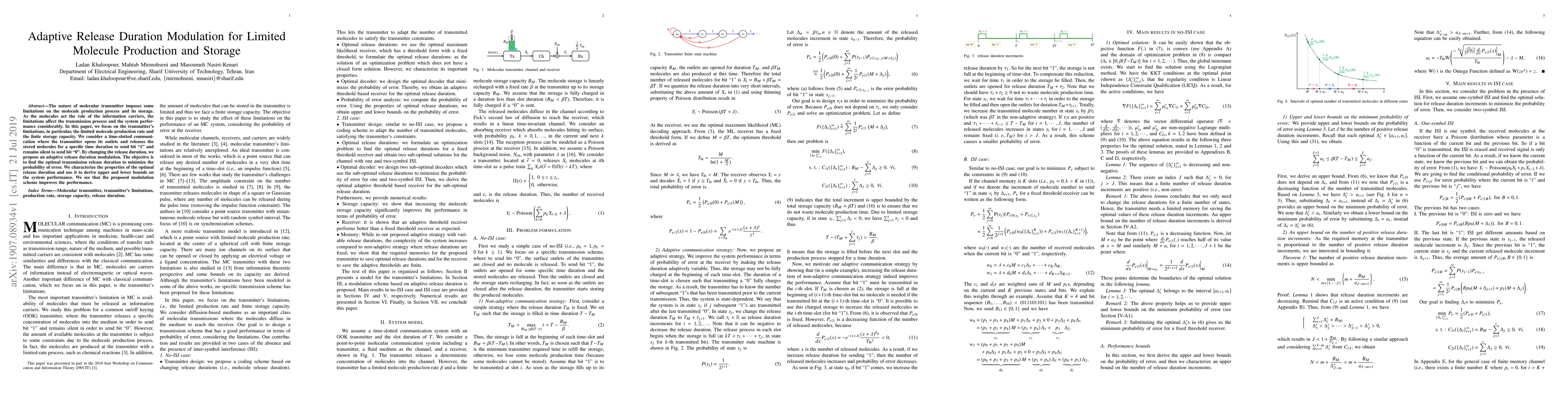 Researchers propose an adaptive release duration modulation to improve communication efficiency in a molecular transmitter with limited production rate and storage capacity. By adjusting the transmission duration, they aim to minimize error probability and enhance system performance.