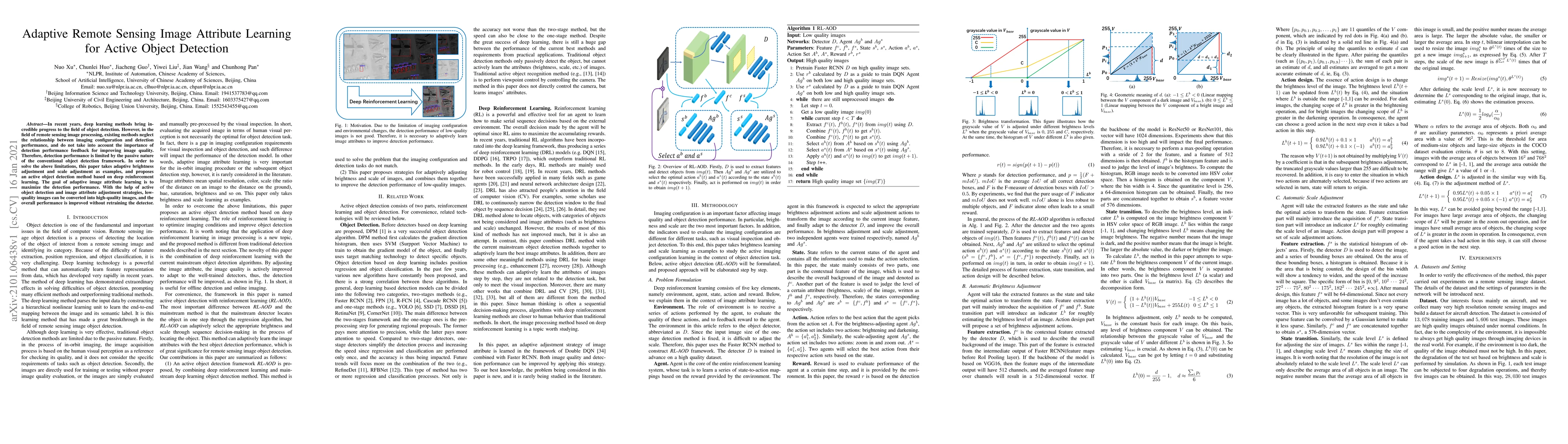 In recent years, deep learning methods bring incredible progress to the field of object detection. However, in the field of remote sensing image processing, existing methods neglect the relationship between imaging configuration and detection performance, and do not take into account the importance of detection performance feedback for improving image quality. Therefore, detection performance is limited by the passive nature of the conventional object detection framework. In order to solve the above limitations, this paper takes adaptive brightness adjustment and scale adjustment as examples, and proposes an active object detection method based on deep reinforcement learning. The goal of adaptive image attribute learning is to maximize the detection performance. With the help of active object detection and image attribute adjustment strategies, low-quality images can be converted into high-quality images, and the overall performance is improved without retraining the detector.