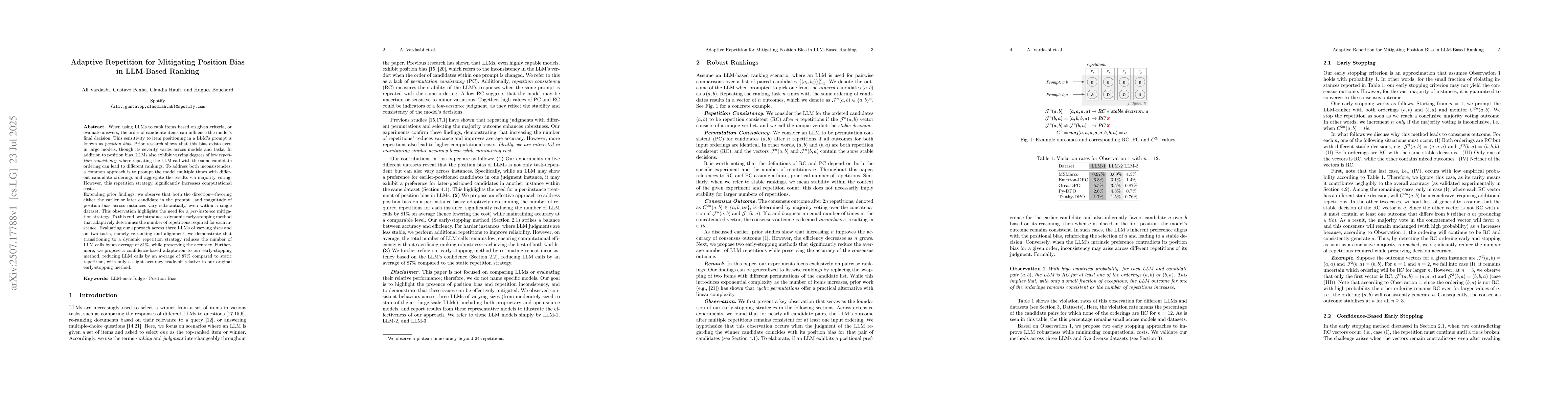 When using LLMs to rank items based on given criteria, or evaluate answers, the order of candidate items can influence the model's final decision. This sensitivity to item positioning in a LLM's prompt is known as position bias. Prior research shows that this bias exists even in large models, though its severity varies across models and tasks. In addition to position bias, LLMs also exhibit varying degrees of low repetition consistency, where repeating the LLM call with the same candidate ordering can lead to different rankings. To address both inconsistencies, a common approach is to prompt the model multiple times with different candidate orderings and aggregate the results via majority voting. However, this repetition strategy, significantly increases computational costs. Extending prior findings, we observe that both the direction -- favoring either the earlier or later candidate in the prompt -- and magnitude of position bias across instances vary substantially, even within a single dataset. This observation highlights the need for a per-instance mitigation strategy. To this end, we introduce a dynamic early-stopping method that adaptively determines the number of repetitions required for each instance. Evaluating our approach across three LLMs of varying sizes and on two tasks, namely re-ranking and alignment, we demonstrate that transitioning to a dynamic repetition strategy reduces the number of LLM calls by an average of 81%, while preserving the accuracy. Furthermore, we propose a confidence-based adaptation to our early-stopping method, reducing LLM calls by an average of 87% compared to static repetition, with only a slight accuracy trade-off relative to our original early-stopping method.