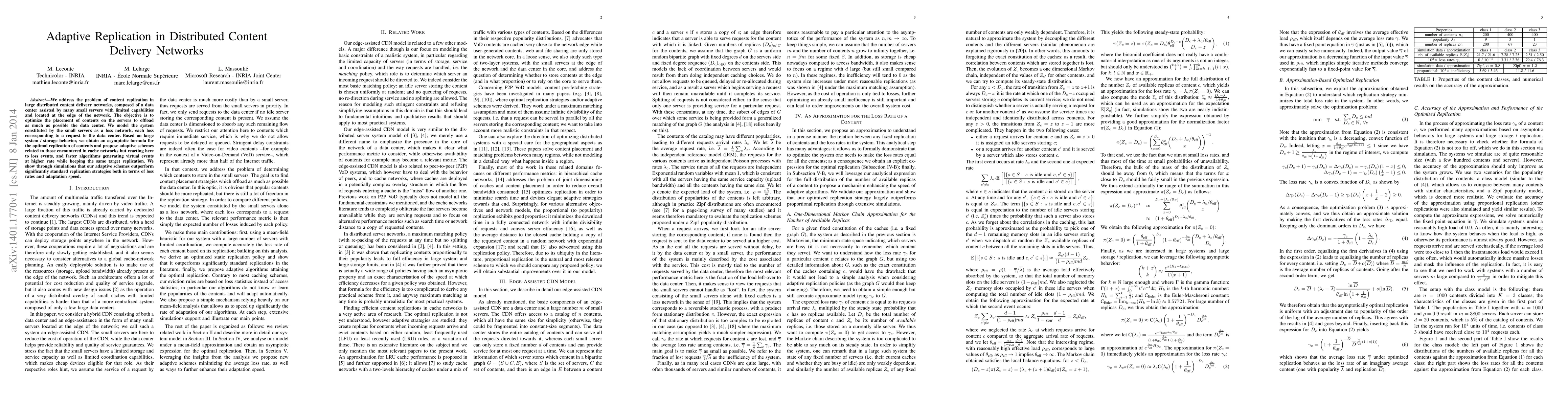 This paper proposes adaptive replication strategies for distributed content delivery networks to optimize content placement on small edge servers, aiming to reduce data center load. The authors develop an asymptotic formula for optimal content replication and introduce adaptive schemes that react to loss events, demonstrating superior performance over standard strategies in simulations.