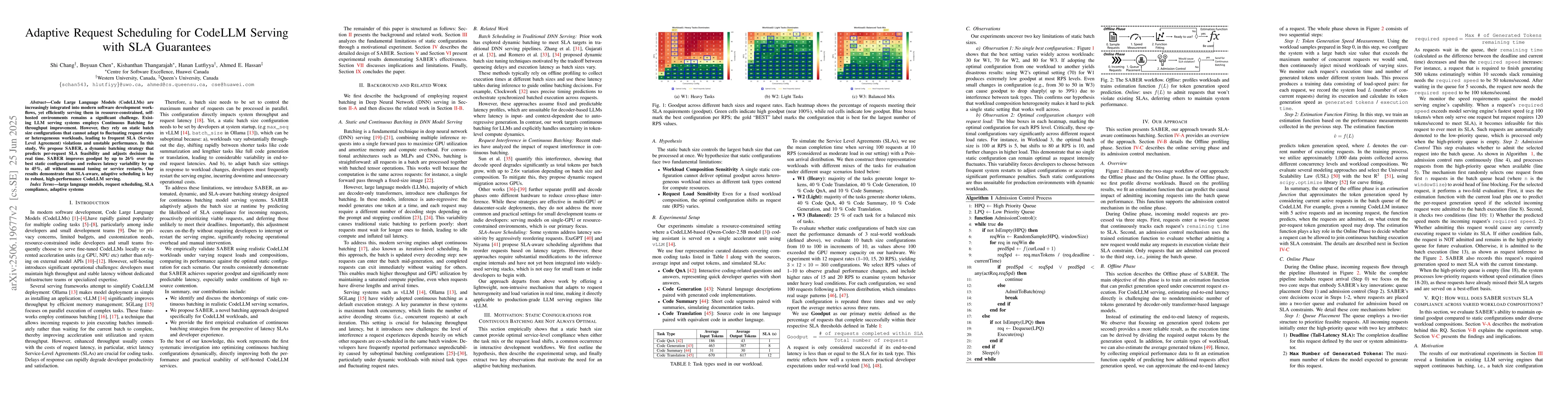 Code Large Language Models (CodeLLMs) are increasingly integrated into modern software development workflows, yet efficiently serving them in resource-constrained, self-hosted environments remains a significant challenge. Existing LLM serving systems employs Continuous Batching for throughput improvement. However, they rely on static batch size configurations that cannot adapt to fluctuating request rates or heterogeneous workloads, leading to frequent SLA (Service Level Agreement) violations and unstable performance. In this study, We propose SABER, a dynamic batching strategy that predicts per-request SLA feasibility and adjusts decisions in real time. SABER improves goodput by up to 26% over the best static configurations and reduces latency variability by up to 45%, all without manual tuning or service restarts. Our results demonstrate that SLA-aware, adaptive scheduling is key to robust, high-performance CodeLLM serving.