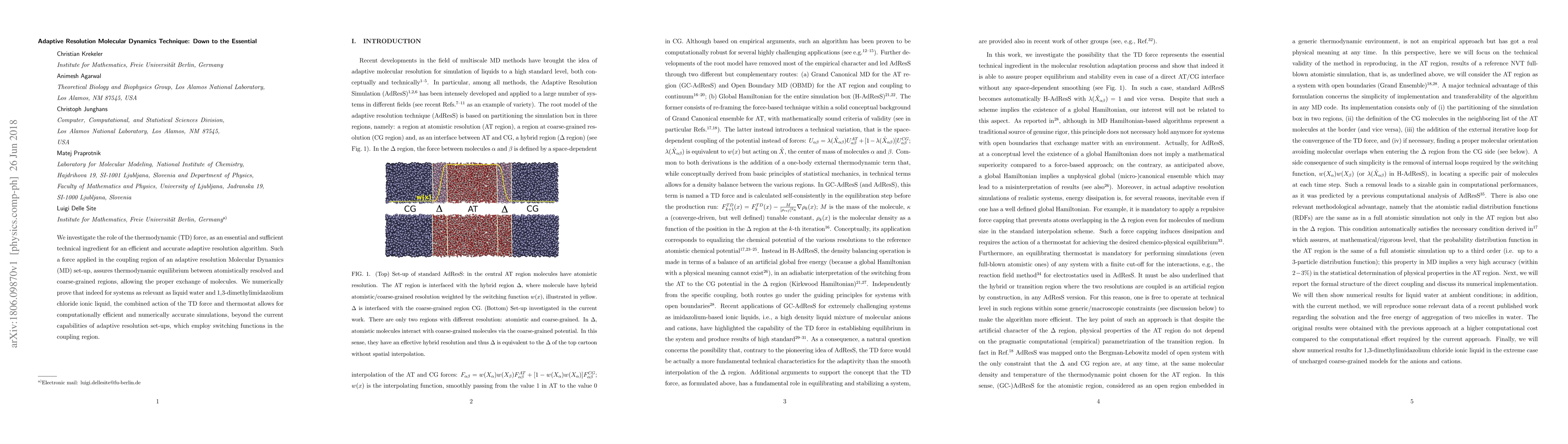 We investigate the role of the thermodynamic (TD) force, as an essential and sufficient technical ingredient for an efficient and accurate adaptive resolution algorithm. Such a force applied in the coupling region of an adaptive resolution Molecular Dynamics (MD) set-up, assures thermodynamic equilibrium between atomistically resolved and coarse-grained regions, allowing the proper exchange of molecules. We numerically prove that indeed for systems as relevant as liquid water and 1,3-dimethylimidazolium chloride ionic liquid, the combined action of the TD force and thermostat allows for computationally efficient and numerically accurate simulations, beyond the current capabilities of adaptive resolution set-ups, which employ switching functions in the coupling region.