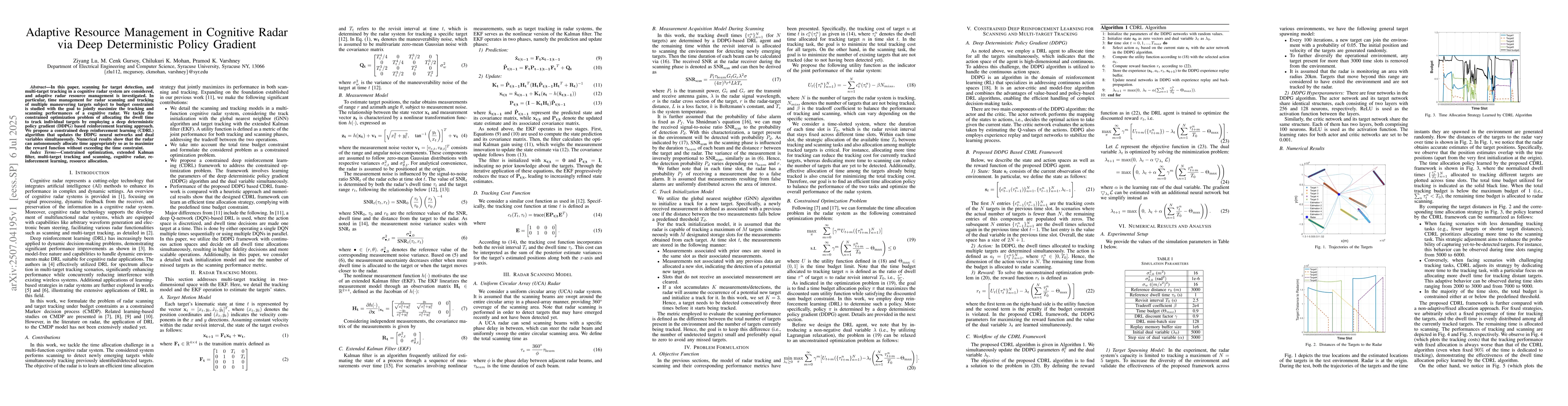 In this paper, scanning for target detection, and multi-target tracking in a cognitive radar system are considered, and adaptive radar resource management is investigated. In particular, time management for radar scanning and tracking of multiple maneuvering targets subject to budget constraints is studied with the goal to jointly maximize the tracking and scanning performances of a cognitive radar. We tackle the constrained optimization problem of allocating the dwell time to track individual targets by employing a deep deterministic policy gradient (DDPG) based reinforcement learning approach. We propose a constrained deep reinforcement learning (CDRL) algorithm that updates the DDPG neural networks and dual variables simultaneously. Numerical results show that the radar can autonomously allocate time appropriately so as to maximize the reward function without exceeding the time constraint.