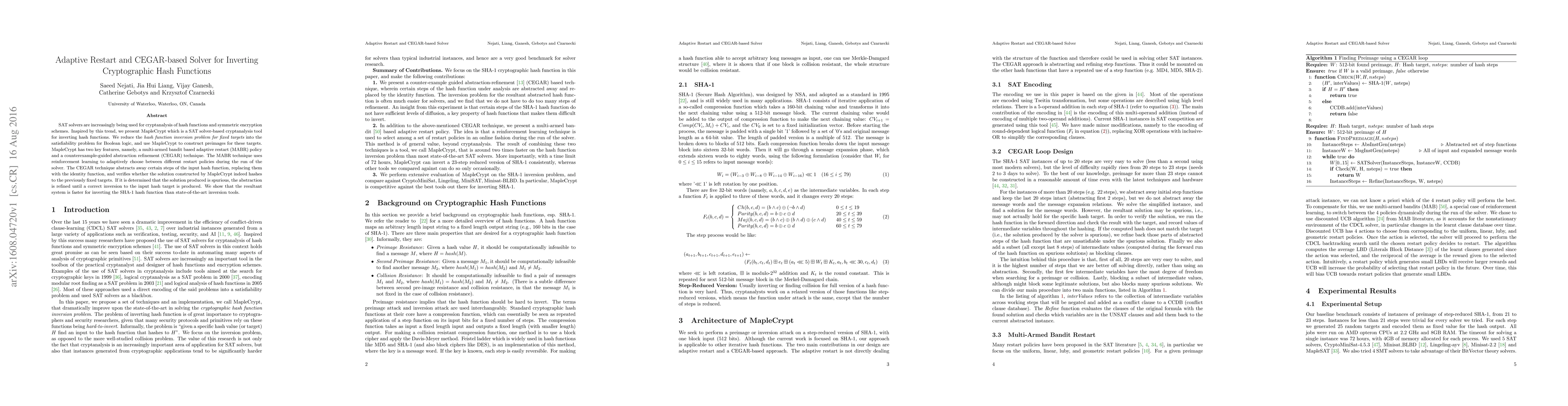 MapleCrypt is a SAT solver-based cryptanalysis tool that employs adaptive restart and CEGAR techniques to invert cryptographic hash functions. It uses reinforcement learning for adaptive restarts and refines abstractions to construct accurate preimages for fixed targets, demonstrating superior performance in SHA-1 inversion compared to existing tools.