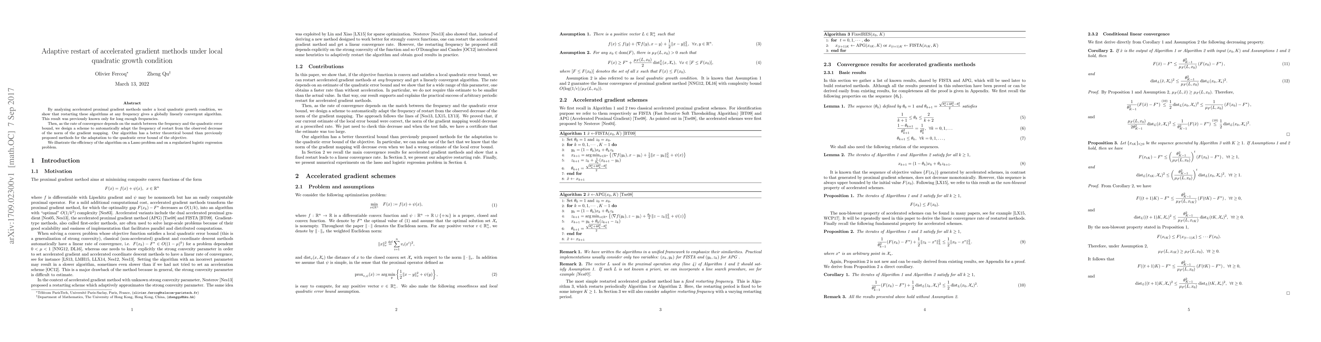 This paper proposes an adaptive restart strategy for accelerated gradient methods under local quadratic growth conditions, demonstrating that restarting at any frequency leads to global linear convergence. It introduces an adaptive scheme to automatically adjust the restart frequency based on gradient norm decrease, achieving a better theoretical bound than previous methods.