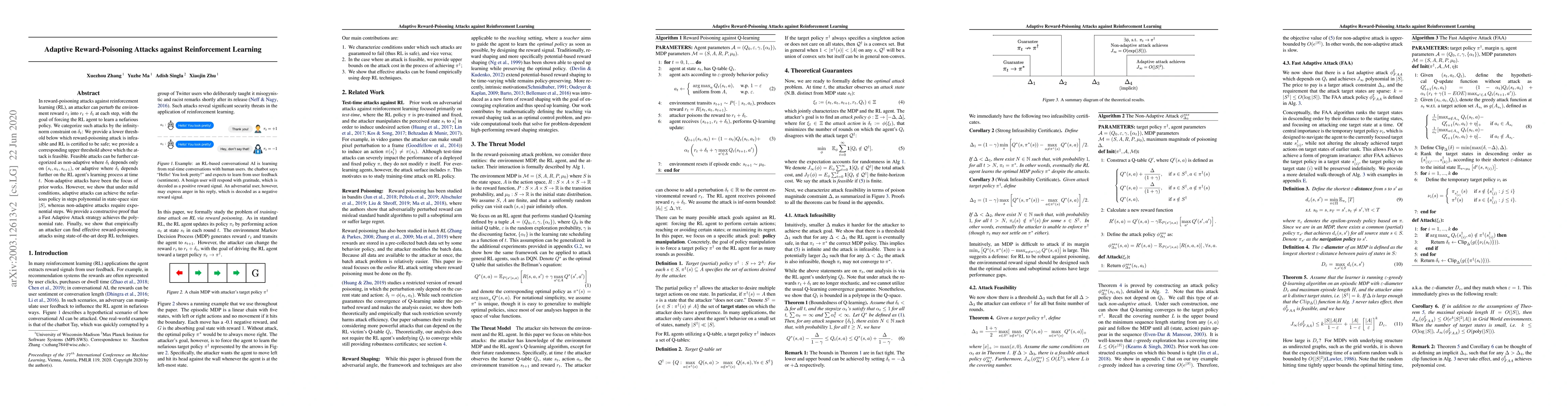 In reward-poisoning attacks against reinforcement learning (RL), an attacker can perturb the environment reward $r_t$ into $r_t+\delta_t$ at each step, with the goal of forcing the RL agent to learn a nefarious policy. We categorize such attacks by the infinity-norm constraint on $\delta_t$: We provide a lower threshold below which reward-poisoning attack is infeasible and RL is certified to be safe; we provide a corresponding upper threshold above which the attack is feasible. Feasible attacks can be further categorized as non-adaptive where $\delta_t$ depends only on $(s_t,a_t, s_{t+1})$, or adaptive where $\delta_t$ depends further on the RL agent's learning process at time $t$. Non-adaptive attacks have been the focus of prior works. However, we show that under mild conditions, adaptive attacks can achieve the nefarious policy in steps polynomial in state-space size $|S|$, whereas non-adaptive attacks require exponential steps. We provide a constructive proof that a Fast Adaptive Attack strategy achieves the polynomial rate. Finally, we show that empirically an attacker can find effective reward-poisoning attacks using state-of-the-art deep RL techniques.