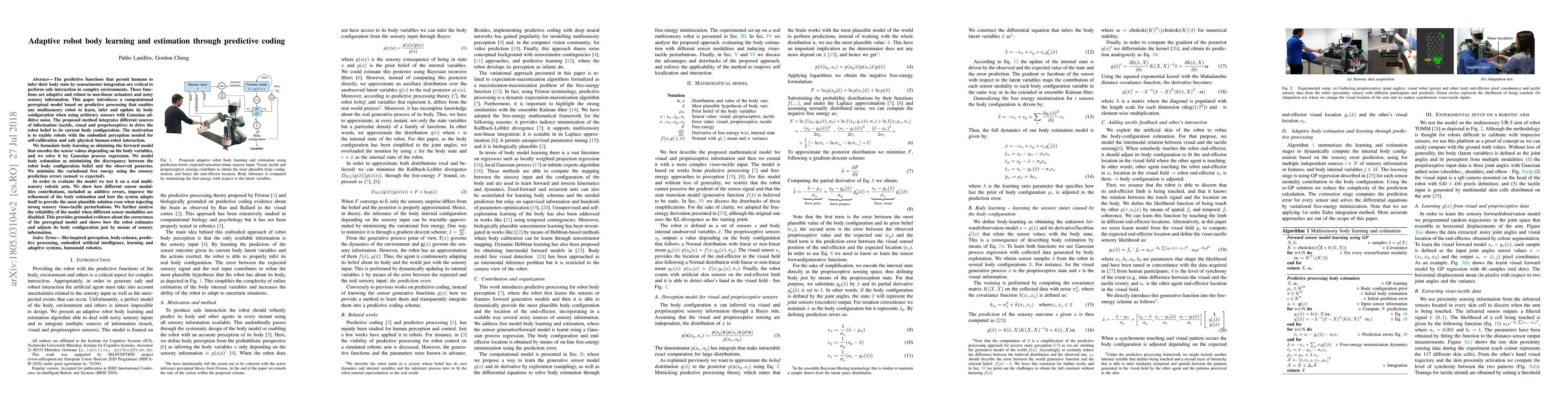 This paper develops a predictive coding model for robots to adaptively learn and estimate their body configuration through sensorimotor integration, utilizing Gaussian process regression and variational free energy minimization. The model, tested on a multisensory robotic arm, demonstrates improved body estimation and self-calibration under noisy and perturbed sensory inputs.