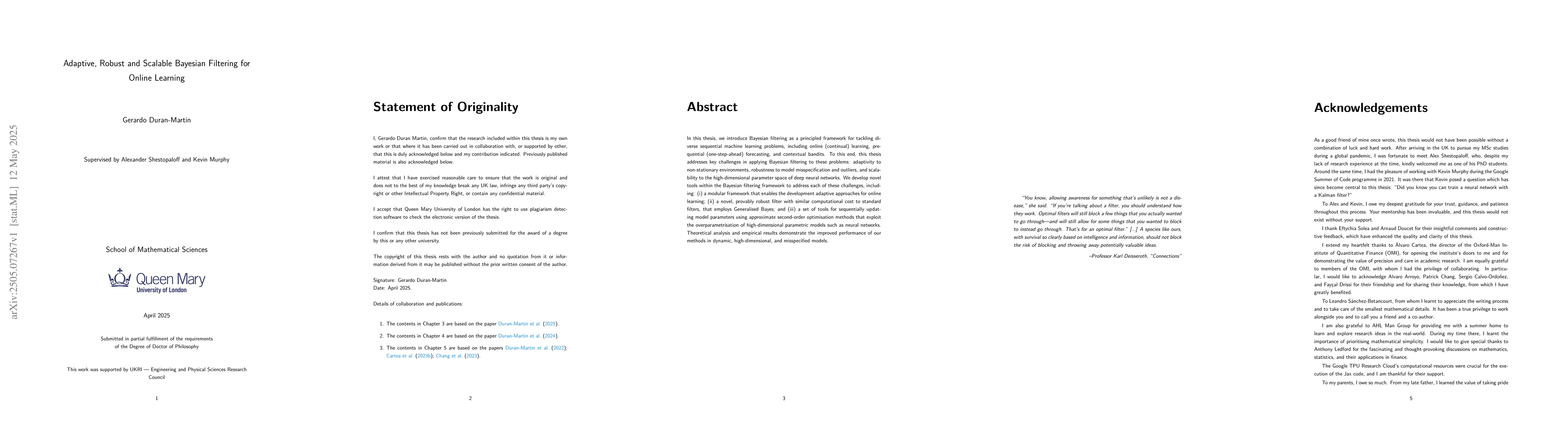The research introduces Bayesian filtering as a framework for addressing diverse sequential machine learning problems, including online learning, forecasting, and contextual bandits. It tackles challenges such as adaptivity to non-stationary environments, robustness to model misspecification and outliers, and scalability to high-dimensional parameter spaces of deep neural networks by developing novel tools within the Bayesian filtering framework.