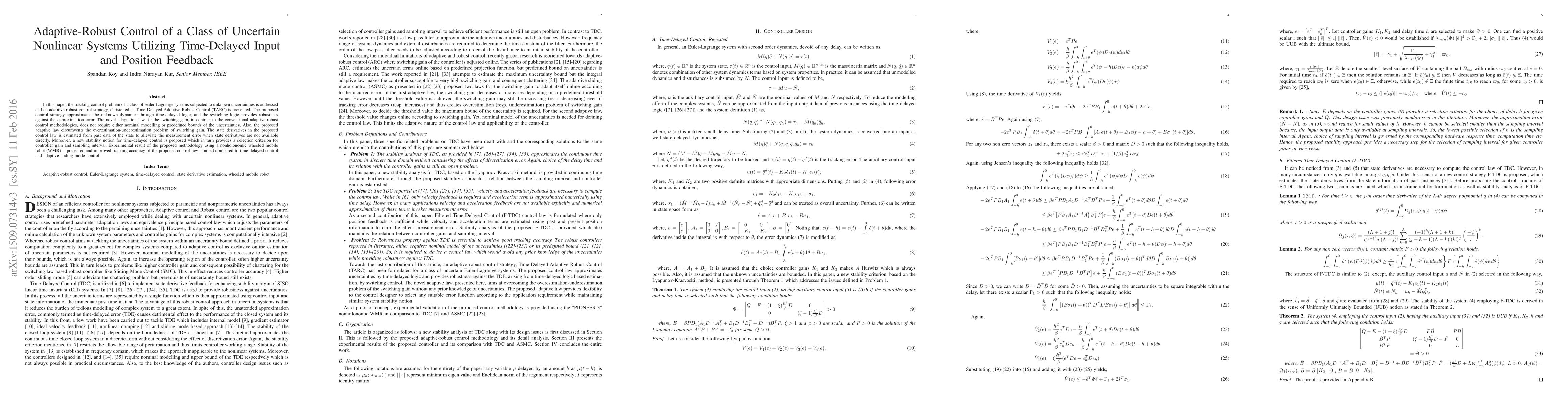 This paper presents an adaptive-robust control strategy called Time-Delayed Adaptive Robust Control (TARC) for uncertain nonlinear Euler-Lagrange systems, which utilizes time-delayed input and position feedback without requiring nominal modeling or predefined uncertainty bounds. Experimental results on a nonholonomic wheeled mobile robot show improved tracking accuracy compared to other control methods.