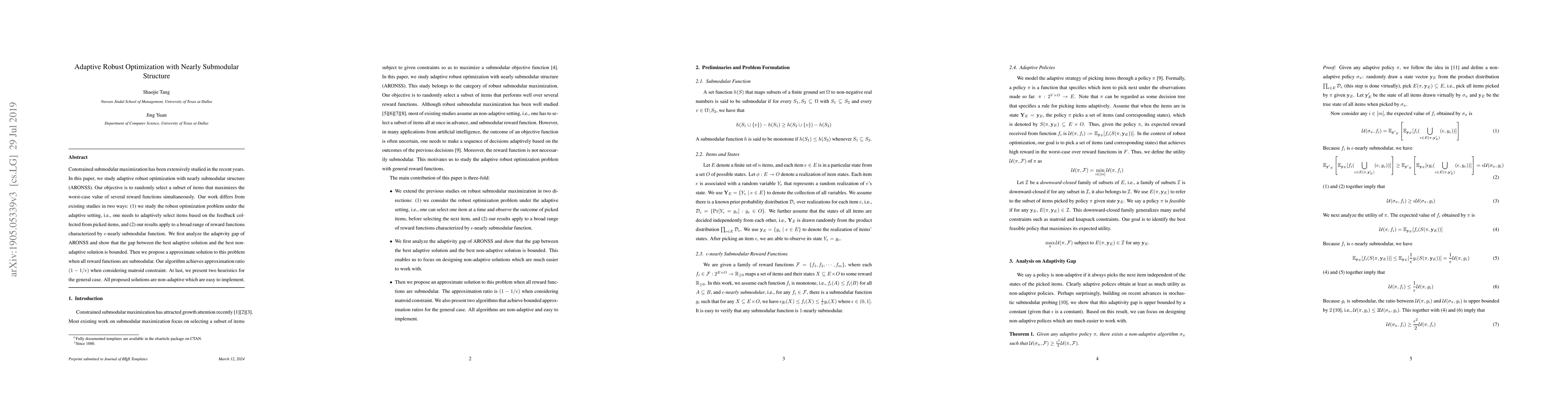 This paper explores adaptive robust optimization with nearly submodular structure, focusing on selecting subsets to maximize worst-case values of multiple reward functions. It introduces adaptive selection based on item feedback and applies to $\epsilon$-nearly submodular functions, proposing algorithms with $(1-1/e)$ approximation ratio under matroid constraints and heuristics for general cases.