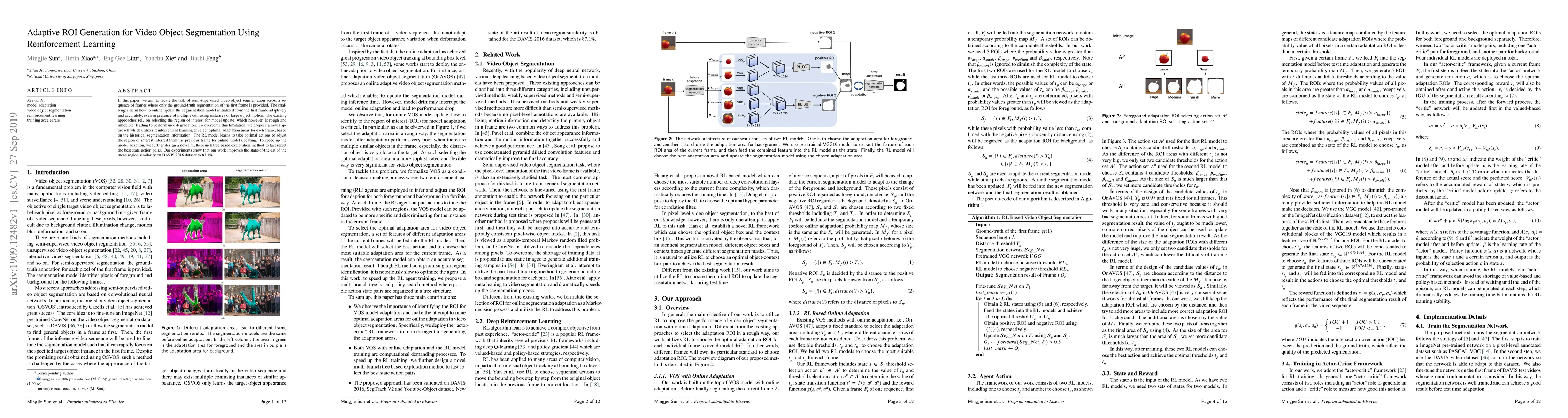 This paper proposes a reinforcement learning approach to adaptively update a video object segmentation model in a semi-supervised setting, selecting optimal regions for model adaptation based on historical segmentation data. The method improves state-of-the-art mean region similarity to 87.1% on the DAVIS 2016 dataset.