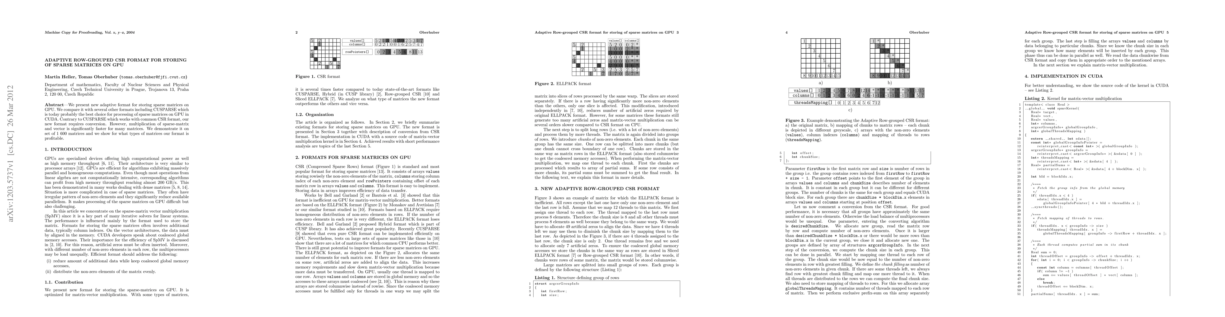 This paper introduces an adaptive row-grouped CSR format for storing sparse matrices on GPUs, demonstrating significant speed improvements in matrix-vector multiplication compared to the CUSPARSE format, particularly for a set of 1,600 matrices. The new format requires conversion but offers notable performance benefits for specific matrix types.