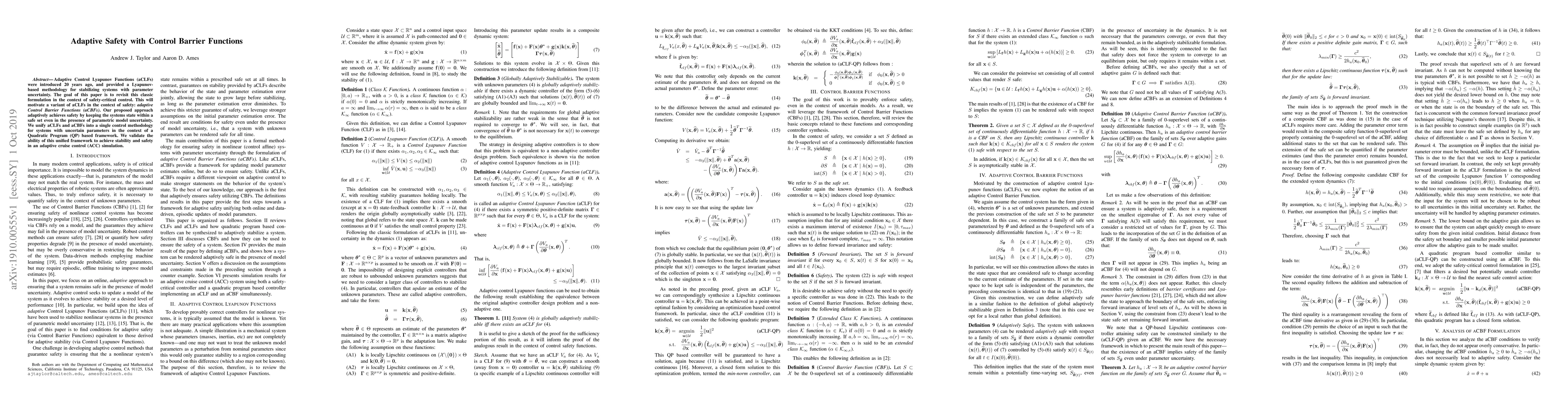 Adaptive Control Lyapunov Functions (aCLFs) were introduced 20 years ago, and provided a Lyapunov-based methodology for stabilizing systems with parameter uncertainty. The goal of this paper is to revisit this classic formulation in the context of safety-critical control. This will motivate a variant of aCLFs in the context of safety: adaptive Control Barrier Functions (aCBFs). Our proposed approach adaptively achieves safety by keeping the systems state within a safe set even in the presence of parametric model uncertainty. We unify aCLFs and aCBFs into a single control methodology for systems with uncertain parameters in the context of a Quadratic Program (QP) based framework. We validate the ability of this unified framework to achieve stability and safety in an adaptive cruise control (ACC) simulation.