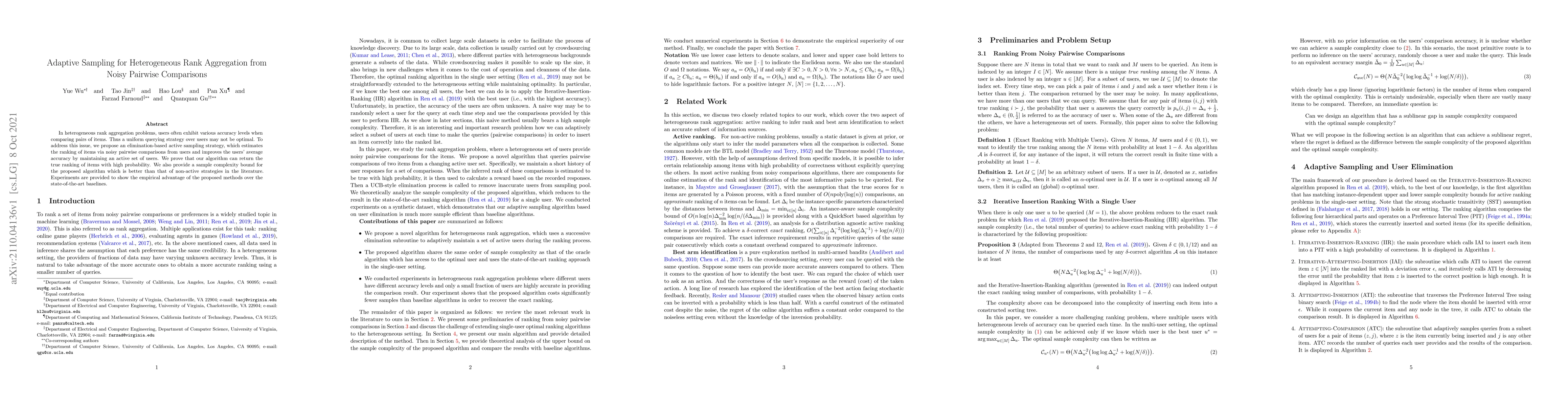 This paper proposes an adaptive sampling strategy for heterogeneous rank aggregation using noisy pairwise comparisons, aiming to optimize querying based on varying user accuracy levels. The elimination-based active sampling method improves user accuracy and provides a sample complexity bound that outperforms non-active strategies.