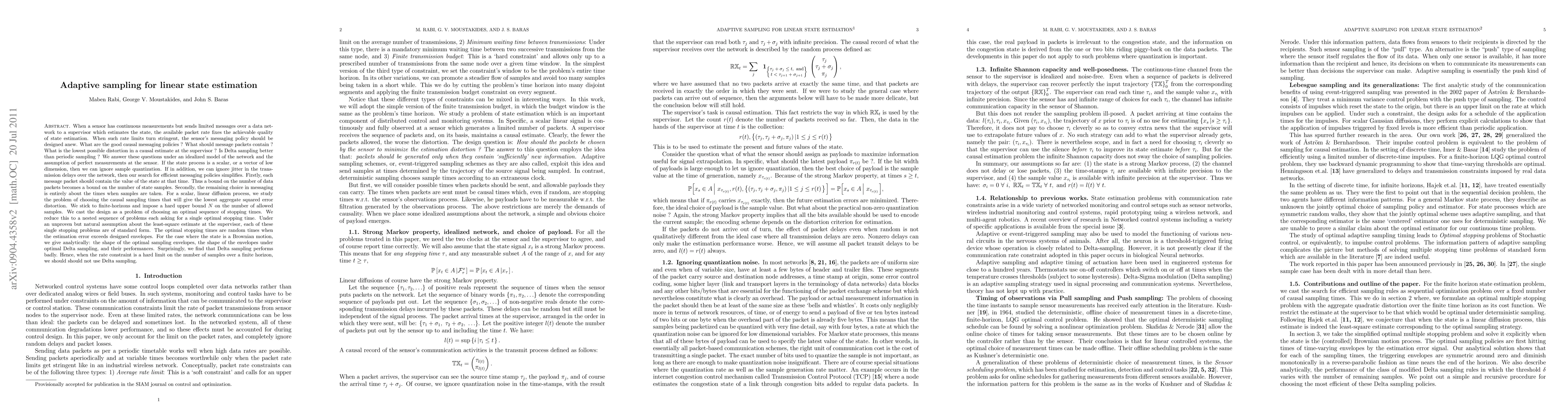 When a sensor has continuous measurements but sends limited messages over a data network to a supervisor which estimates the state, the available packet rate fixes the achievable quality of state estimation. When such rate limits turn stringent, the sensor's messaging policy should be designed anew. What are the good causal messaging policies ? What should message packets contain ? What is the lowest possible distortion in a causal estimate at the supervisor ? Is Delta sampling better than periodic sampling ? We answer these questions under an idealized model of the network and the assumption of perfect measurements at the sensor. For a scalar, linear diffusion process, we study the problem of choosing the causal sampling times that will give the lowest aggregate squared error distortion. We stick to finite-horizons and impose a hard upper bound on the number of allowed samples. We cast the design as a problem of choosing an optimal sequence of stopping times. We reduce this to a nested sequence of problems each asking for a single optimal stopping time. Under an unproven but natural assumption about the least-square estimate at the supervisor, each of these single stopping problems are of standard form. The optimal stopping times are random times when the estimation error exceeds designed envelopes. For the case where the state is a Brownian motion, we give analytically: the shape of the optimal sampling envelopes, the shape of the envelopes under optimal Delta sampling, and their performances. Surprisingly, we find that Delta sampling performs badly. Hence, when the rate constraint is a hard limit on the number of samples over a finite horizon, we should should not use Delta sampling.