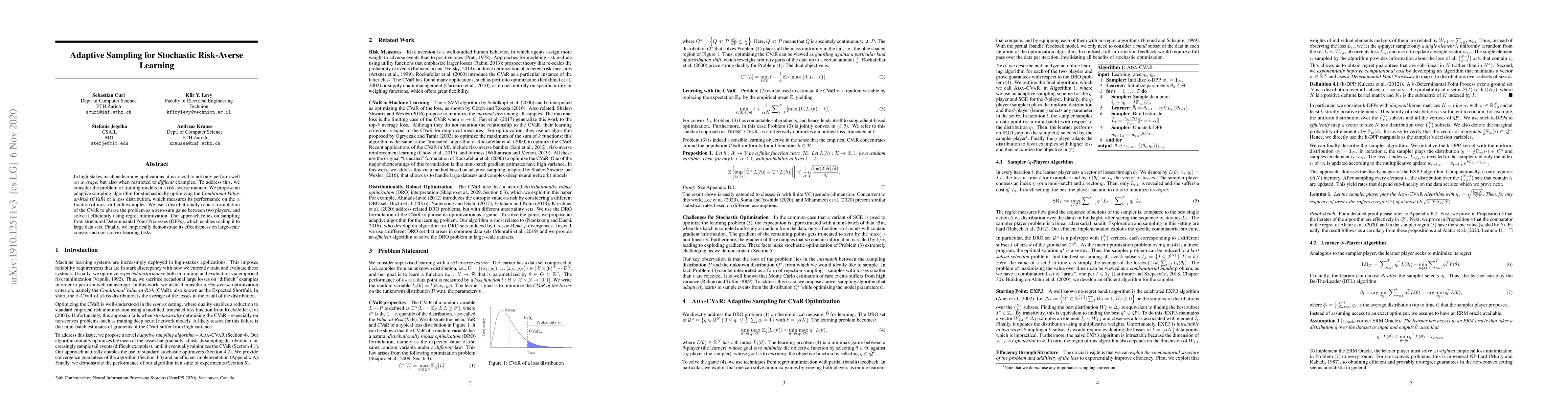 This paper proposes an adaptive sampling algorithm for training risk-averse machine learning models by optimizing the Conditional Value-at-Risk (CVaR) to ensure performance on difficult examples. It employs a distributionally robust CVaR formulation and leverages Determinantal Point Processes for scalability.